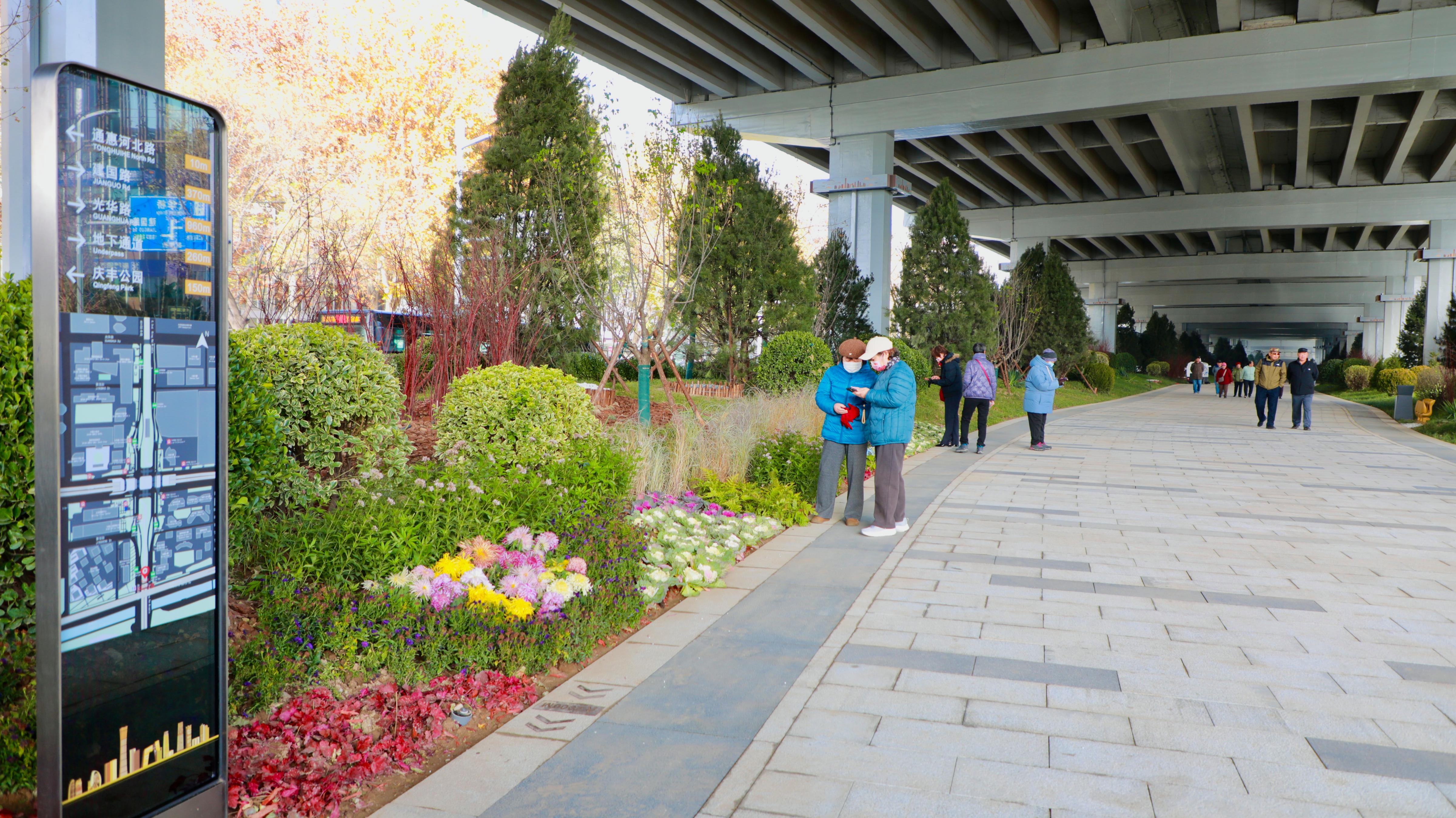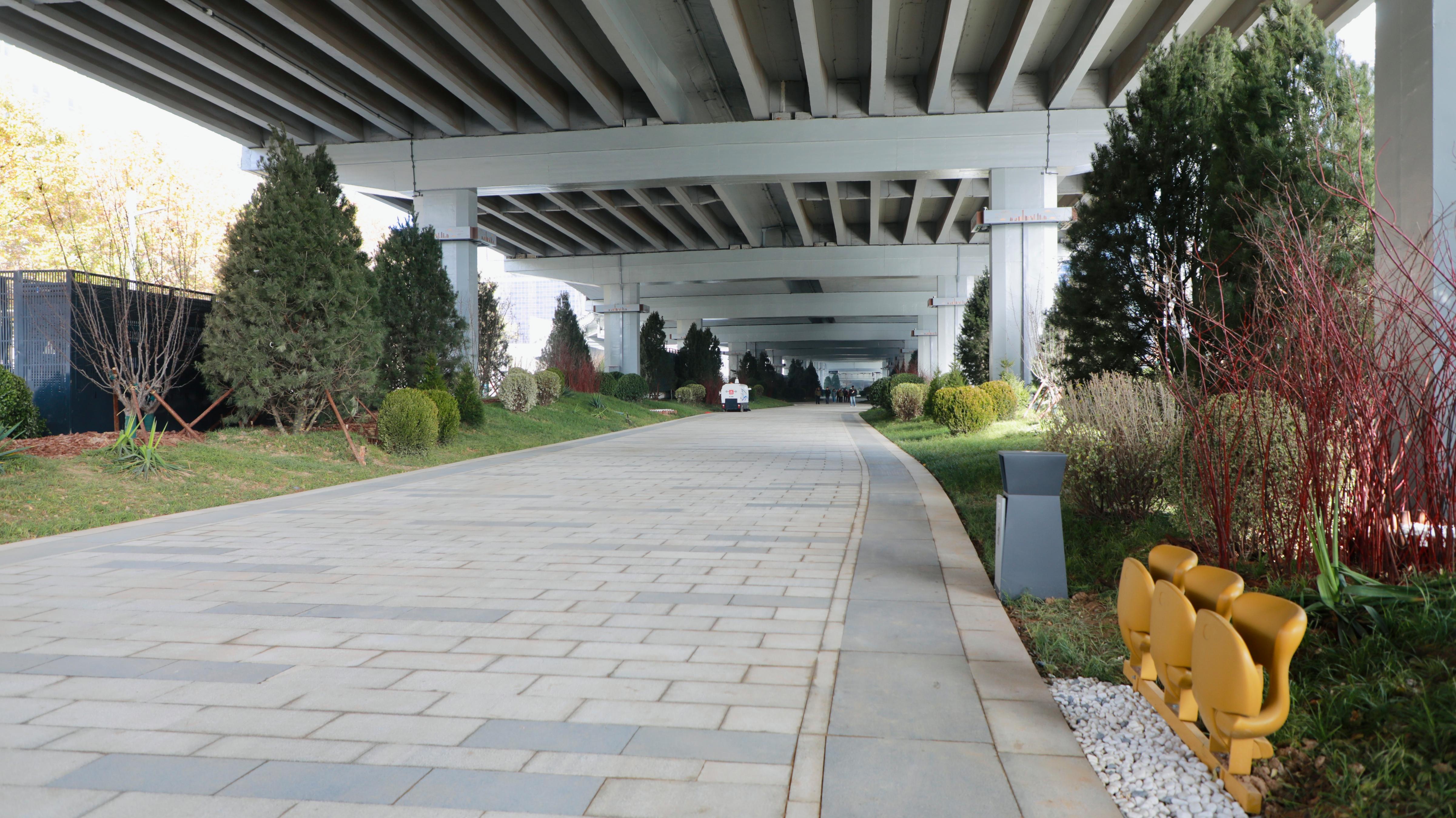 除了交通优化,景观品质提升也是此次改造的重点。为应对桥下光照不足的特点,专门种植了耐阴喜阴的植物,搭配曾用于“九三阅兵”观礼区的金黄色座椅,营造出四季皆景、通透大气的休闲环境。夜景照明系统的配套布设,让慢行路在夜晚也兼具实用性与观赏性。此外,还同步完成了桥梁外立面粉刷与线缆清理,使桥下空间更加通透美观,为市民提供了安全舒适的步行与骑行环境。