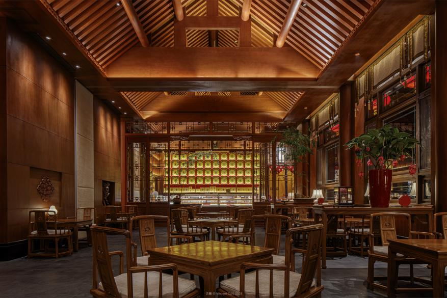 仿膳茶社位于北海公园北岸,紧邻静心斋、澄观堂、五龙亭。空间设计从清代古画中提取炭黑、鹤灰、焦茶等传统色彩,转译为金砖、实木、赤漆等建筑材质,将“房前有院、轴线贯穿”的传统建筑格局融入现代商业场景,契合当代消费习惯的沉浸式体验空间。