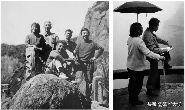 左图:登黄山(左起:梅溪、祝大年、黄永玉、吴冠中、袁运甫) 右图:1983年,吴冠中夫妇在黄山雨中写生
