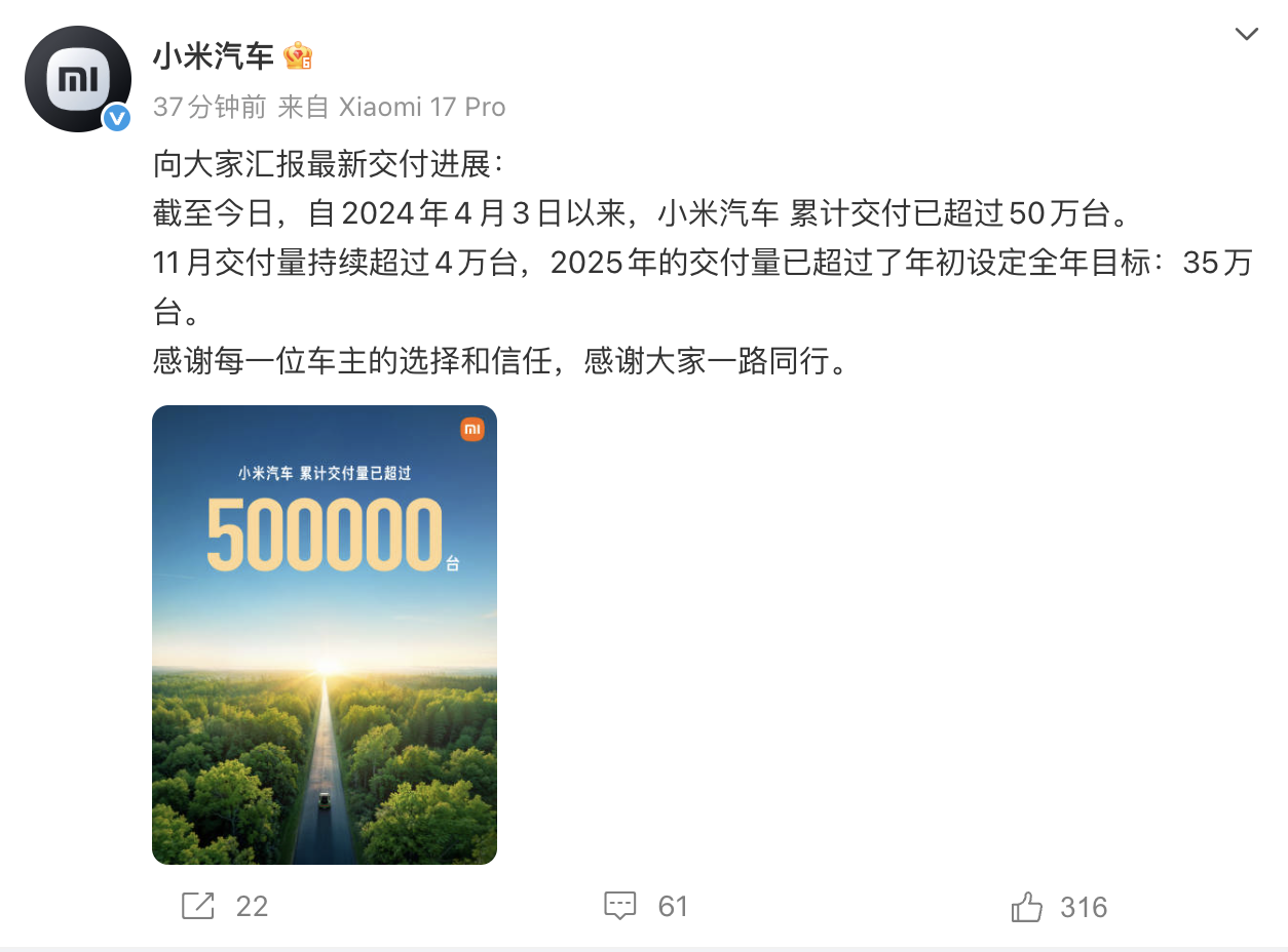 截至今日,自2024年4月3日以来,小米汽车累计交付已超过50万台。