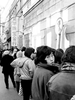 1993年,在王府井大街一家外汇黄金珠宝店前,人们排队购买商品。