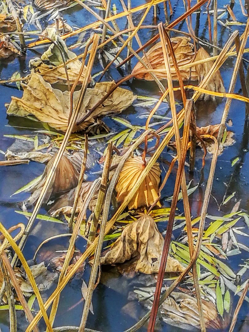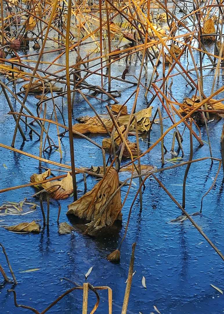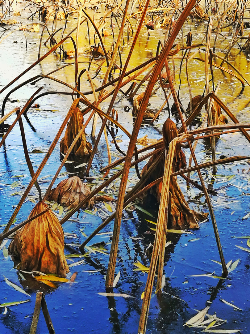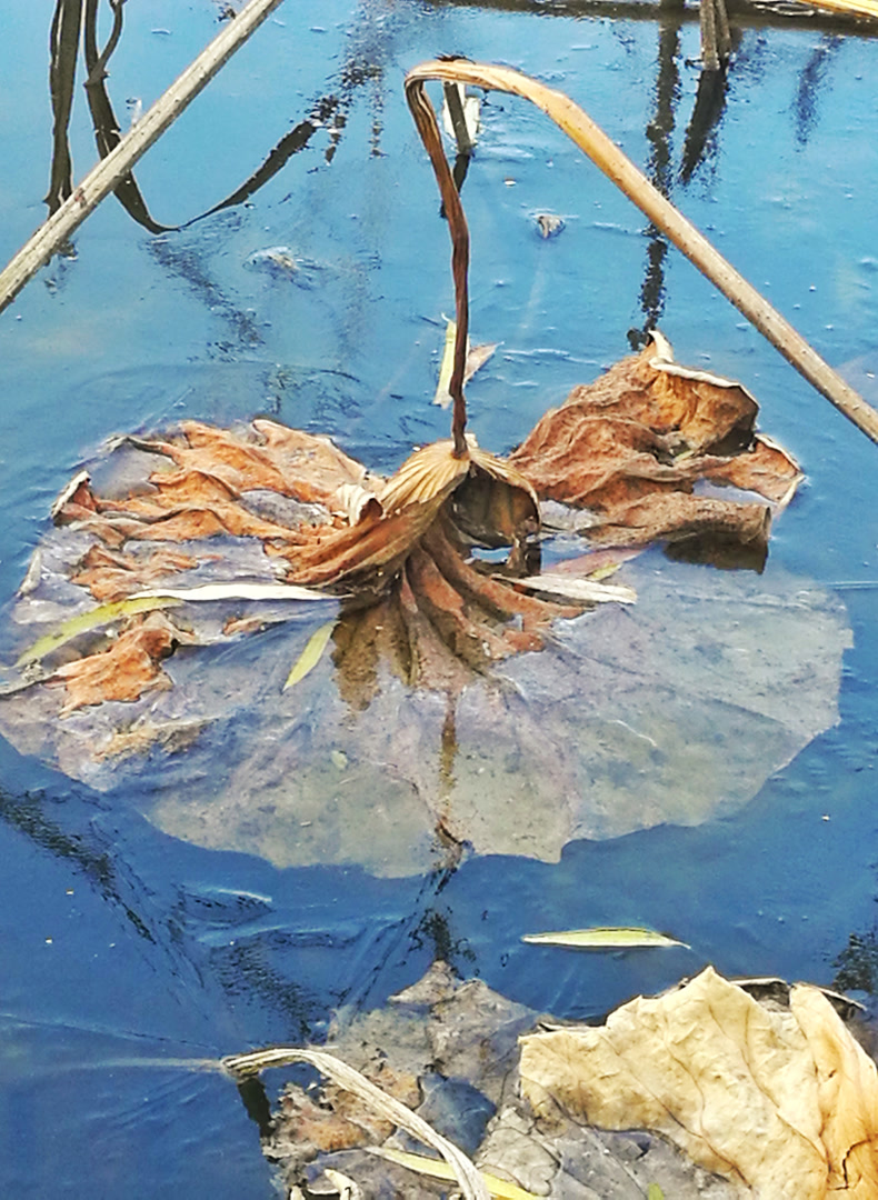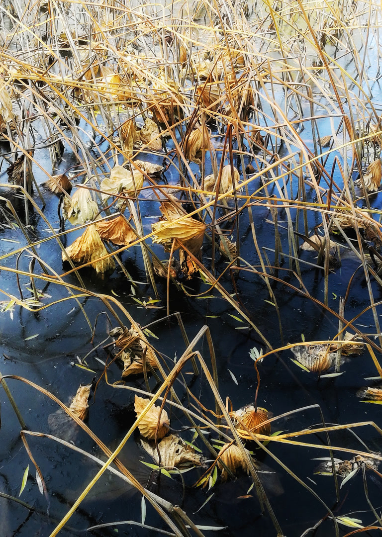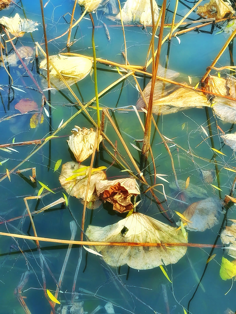 你看那枯槁的茎秆,弯折、倒伏、却又倔强地指向天空,勾勒出堪比书法飞白的凌厉线条。你看那皲裂蜷缩的荷叶,脉络嶙峋,沉淀着风雨阳光走过的每一道年轮。繁华谢幕,喧嚣归于沉寂,生命的余韵却凝练成了最震撼的轮廓。此时,美不再是绽放,而是风骨。