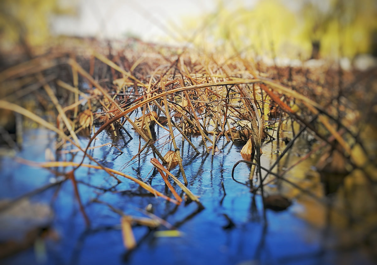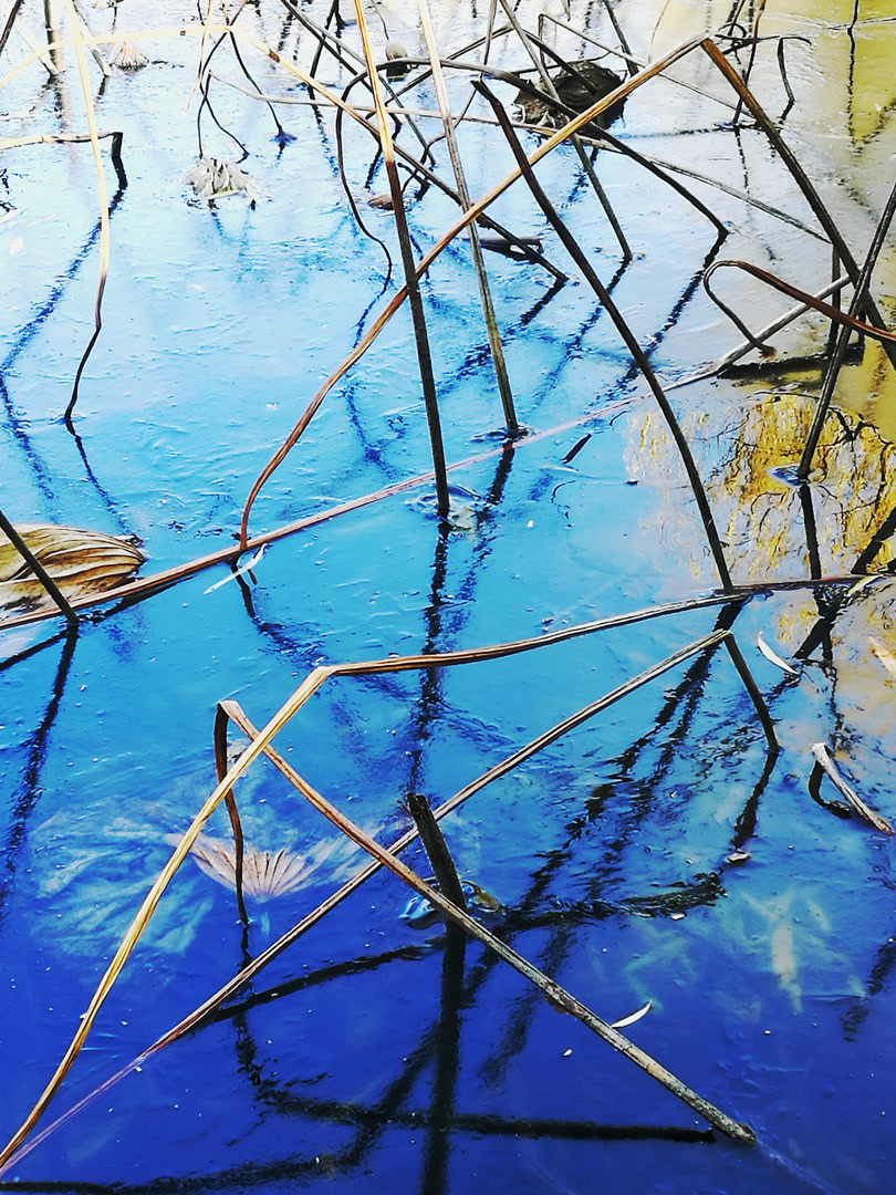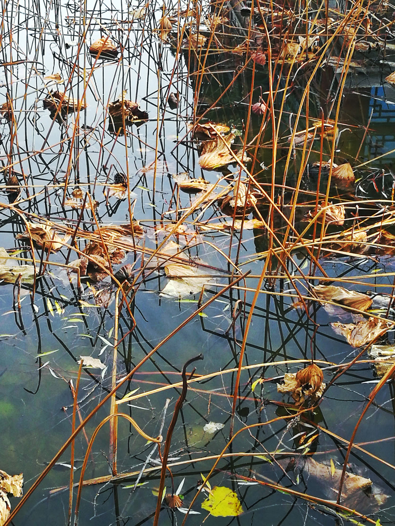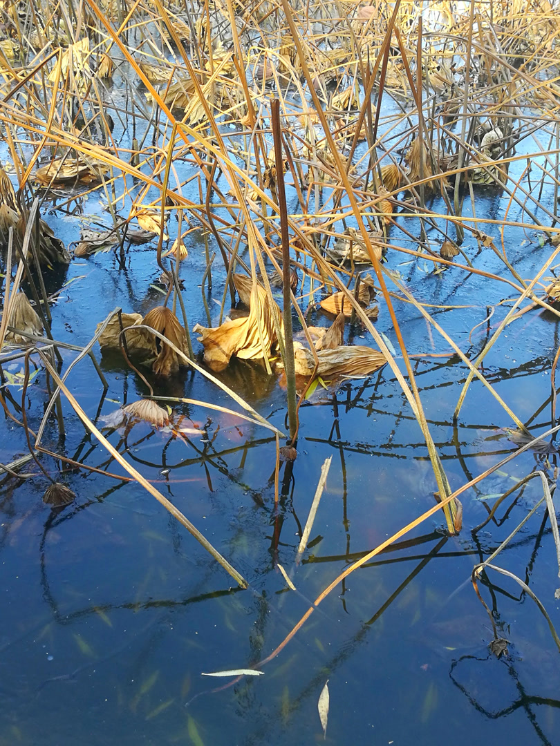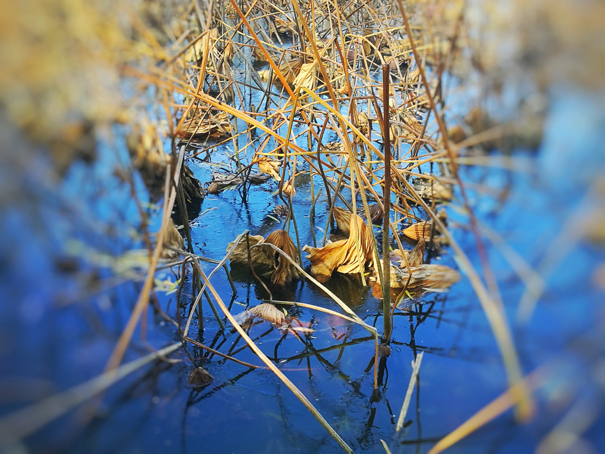 你看那枯槁的茎秆,弯折、倒伏、却又倔强地指向天空,勾勒出堪比书法飞白的凌厉线条。你看那皲裂蜷缩的荷叶,脉络嶙峋,沉淀着风雨阳光走过的每一道年轮。繁华谢幕,喧嚣归于沉寂,生命的余韵却凝练成了最震撼的轮廓。此时,美不再是绽放,而是风骨。