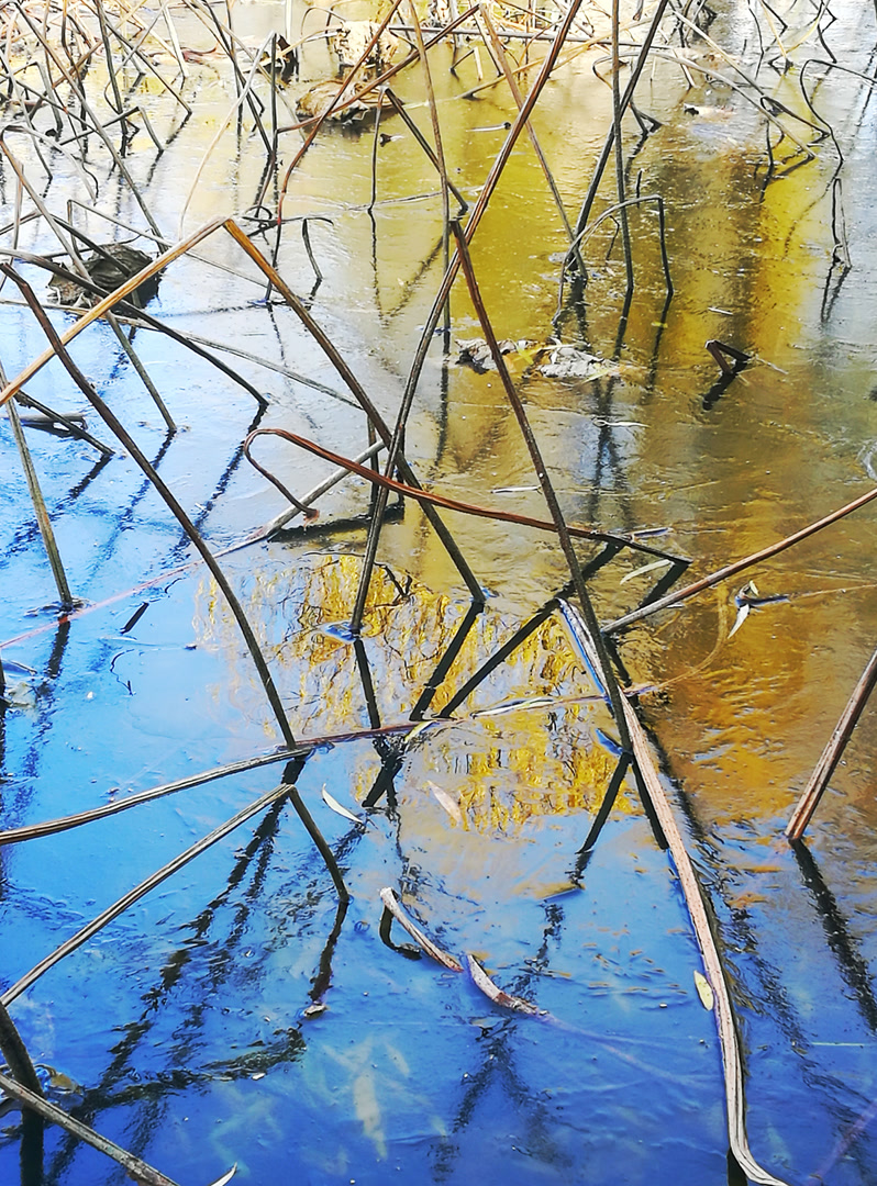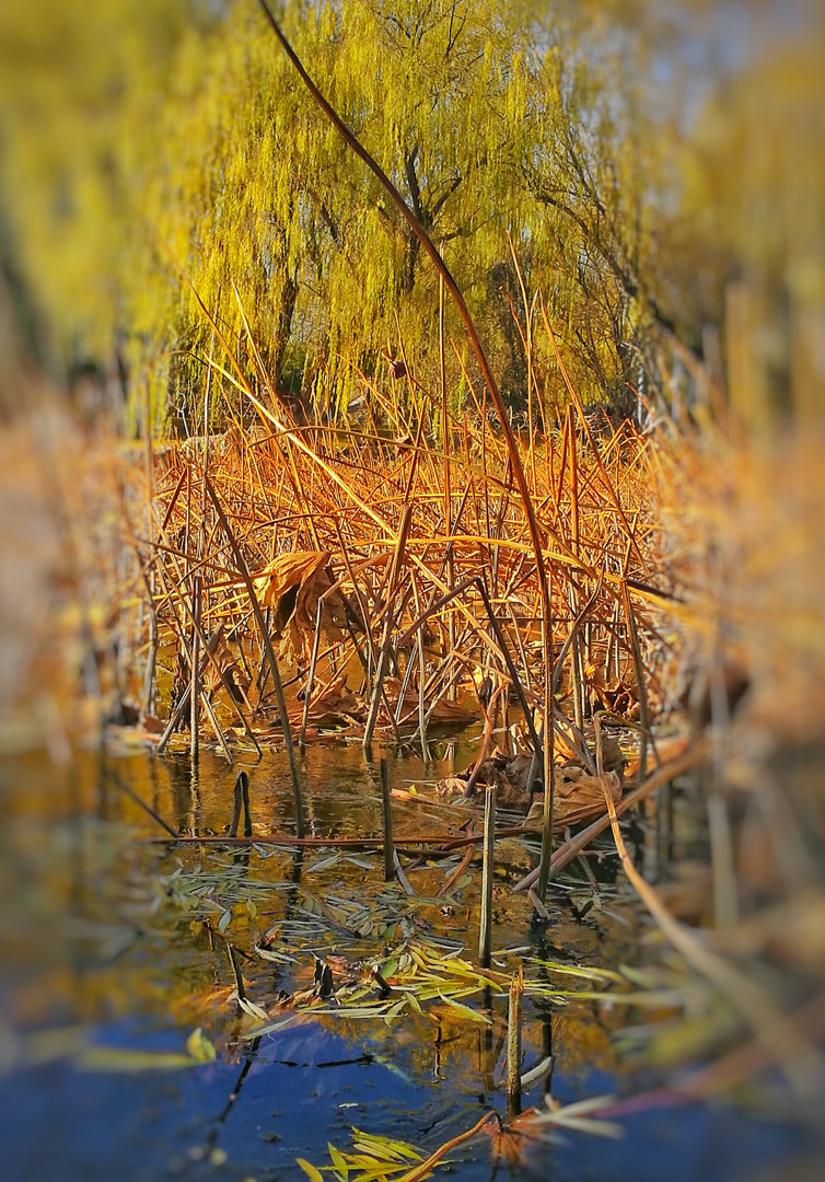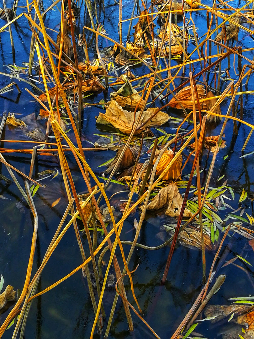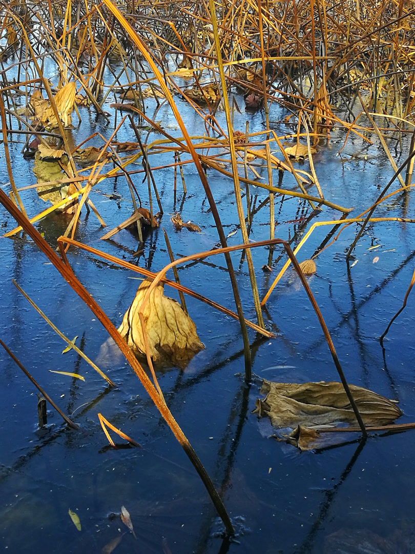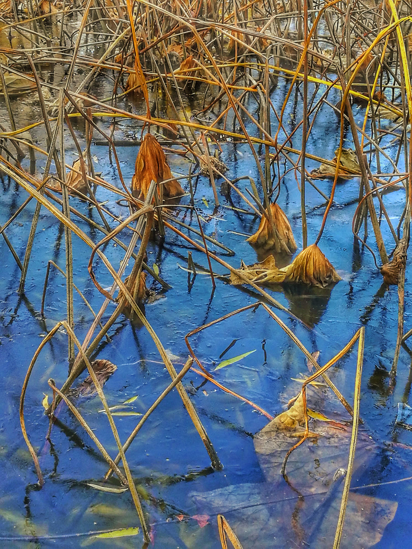 你看那枯槁的茎秆,弯折、倒伏、却又倔强地指向天空,勾勒出堪比书法飞白的凌厉线条。你看那皲裂蜷缩的荷叶,脉络嶙峋,沉淀着风雨阳光走过的每一道年轮。繁华谢幕,喧嚣归于沉寂,生命的余韵却凝练成了最震撼的轮廓。此时,美不再是绽放,而是风骨。