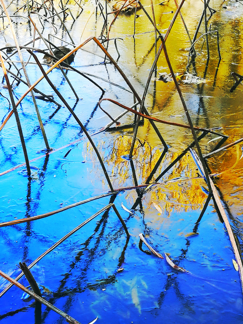 水面如镜,倒映着另一个虚实交错的世界。残荷的嶙峋身影与水中的幻象相接,仿佛在低语着一个关于轮回的故事。有人说这是“残败”,我却认为,这是生命最高级的形态。