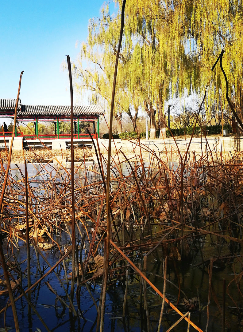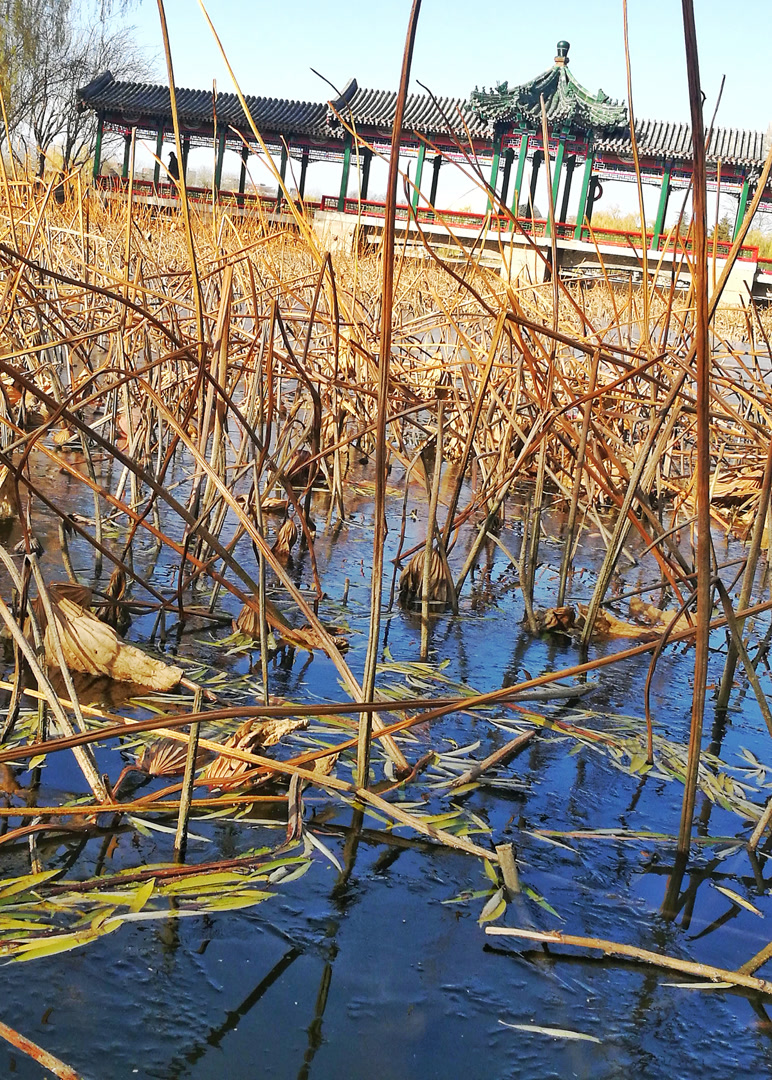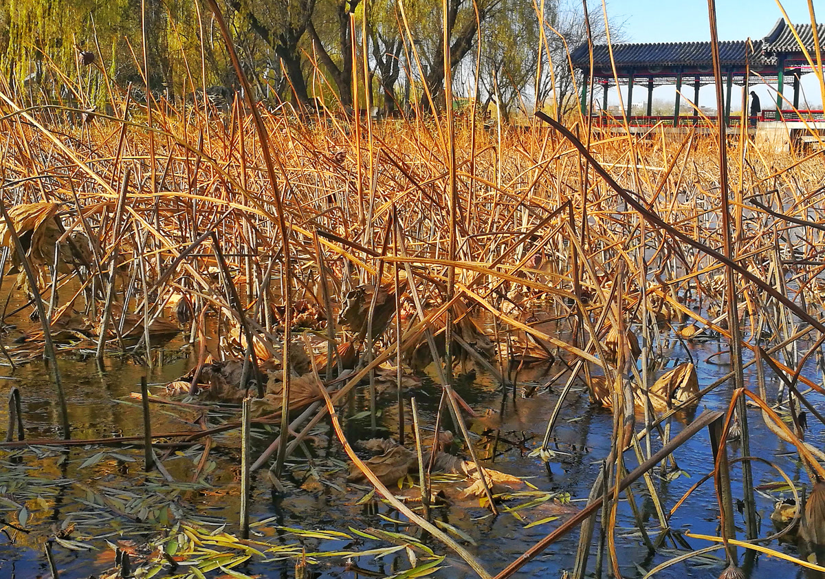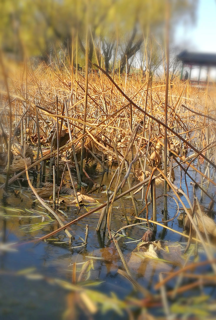 在龙潭公园静谧的水畔,一片残荷正以一种孤傲且诗意的姿态伫立。枯萎的荷瓣与细长的茎梗,勾勒出岁月的沧桑轮廓。它们曾于盛夏热烈绽放,如今却在秋风中褪去繁华,独守一份清冷与寂寥。此刻你是否发现,褪去盛夏的灼灼其华,荷,才真正开始了它最深邃的表达。 它收起了明媚的色彩,以枝为笔,以影为墨,在水镜之上,写下了一阕只有静心才能读懂的极简诗行。