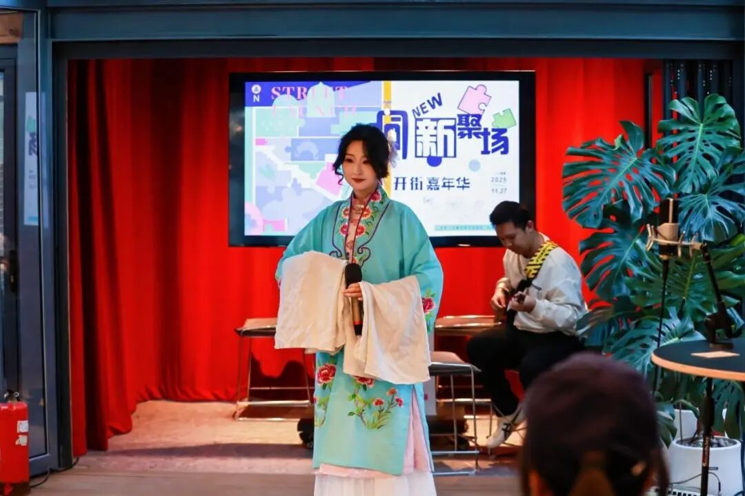 紧随其后,非遗新生代快板艺术家邹子俊以《快板新韵》奏响传统曲艺的现代节拍,曹琳琳的创新京剧《水袖梨花颂》则以新颖表达诠释国粹精髓。活动现场配套推出的街区非遗创新巡街快闪,以沉浸式体验引发居民强烈共鸣,现场反响热烈,居民纷纷对街区环境提升和新业态入驻表达欣喜与亲切之情。