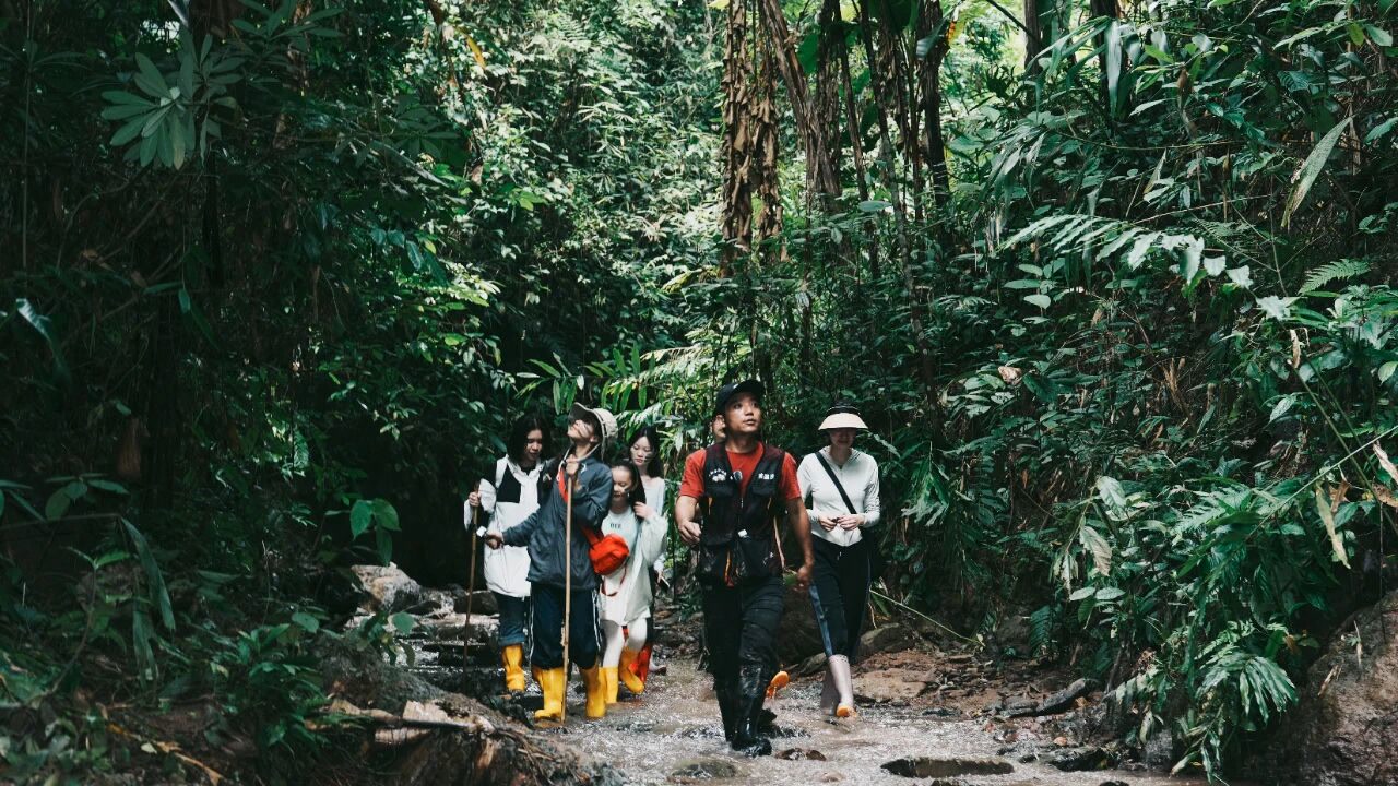 清晨,晨雾还未散去,已经有不少游客沿着基诺山雨林线路徒步,跟随向导的讲解和介绍,穿过河流,观赏动植物,体验石头彩绘、秋千、射箭等项目,在自然科普和探险中感受热带雨林的独特魅力。