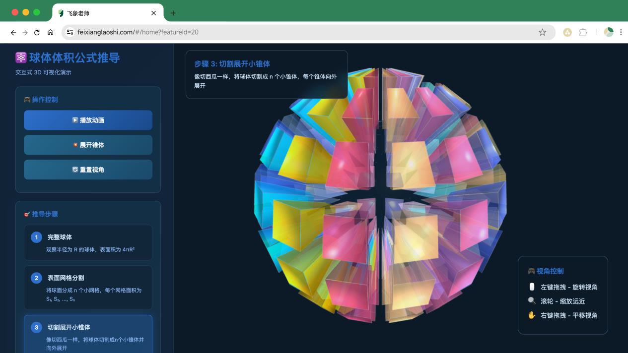 以“球体体积公式”体验后发现,当输入指令后系统生成的不再是静态视频,而是一个可交互的3D几何演示模型,学生可通过拖拽、旋转来直观探究推导过程;针对“勾股定理”或“立体几何”等抽象难点,也能生成动态的可视化交互课件。