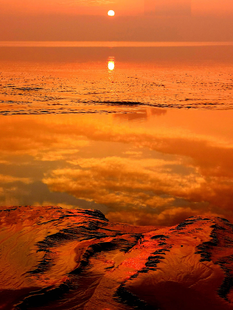 潮水相拥夕阳也总是这样的浪漫:潮水像一个靓丽的“女孩”,向往着夕阳的炽热,享受着夕阳的明媚,款款而来缓缓地拥入夕阳的怀抱,并映射出夕阳橘黄色及暗红色光芒。