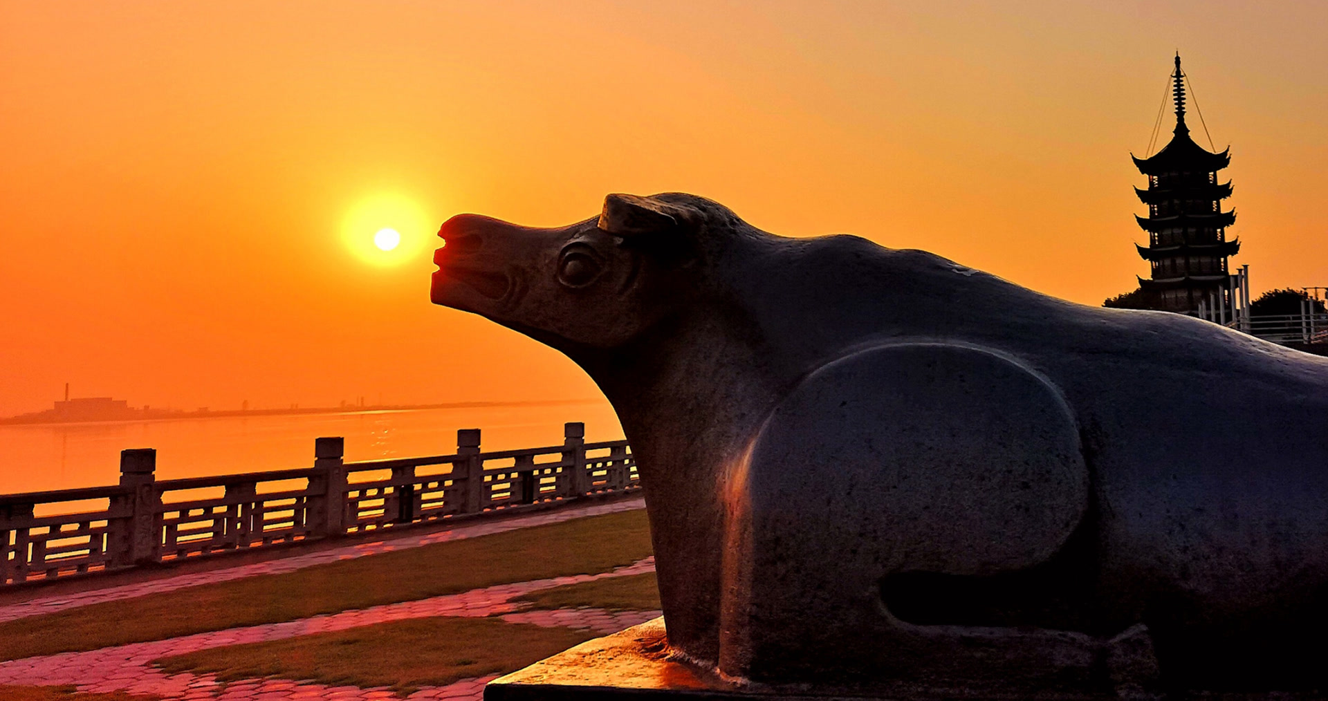 盐官,是著名观潮胜地。海塘上,威武的“镇海铁牛”相“吻”从天上远道而来的冬日夕阳,有趣的景象,令铁牛生辉,让游客喜悦。