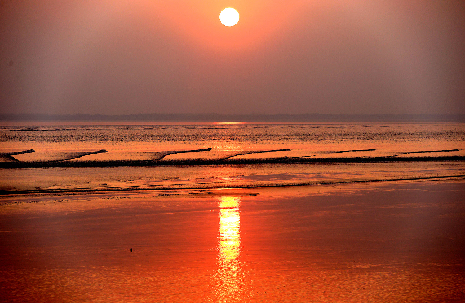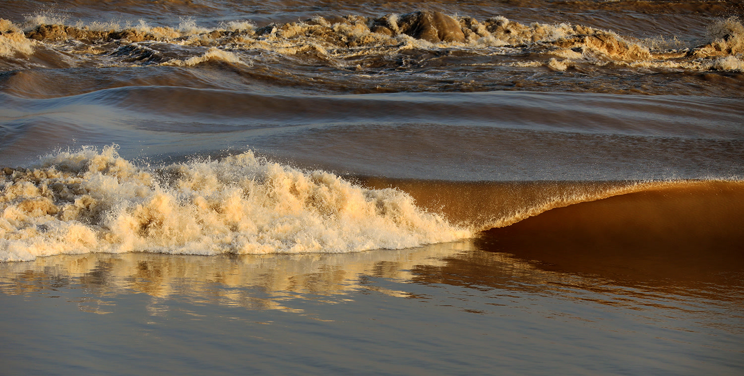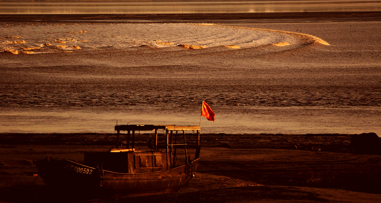 冬日夕阳与潮水的“约会”,总是这样的温馨:夕阳像一个有礼貌的“男士”,常常早先一步行动,将橘黄色或者暗红色光芒投射在江面上,为迎接潮水到来营造出非常热烈、非常温暖的氛围。