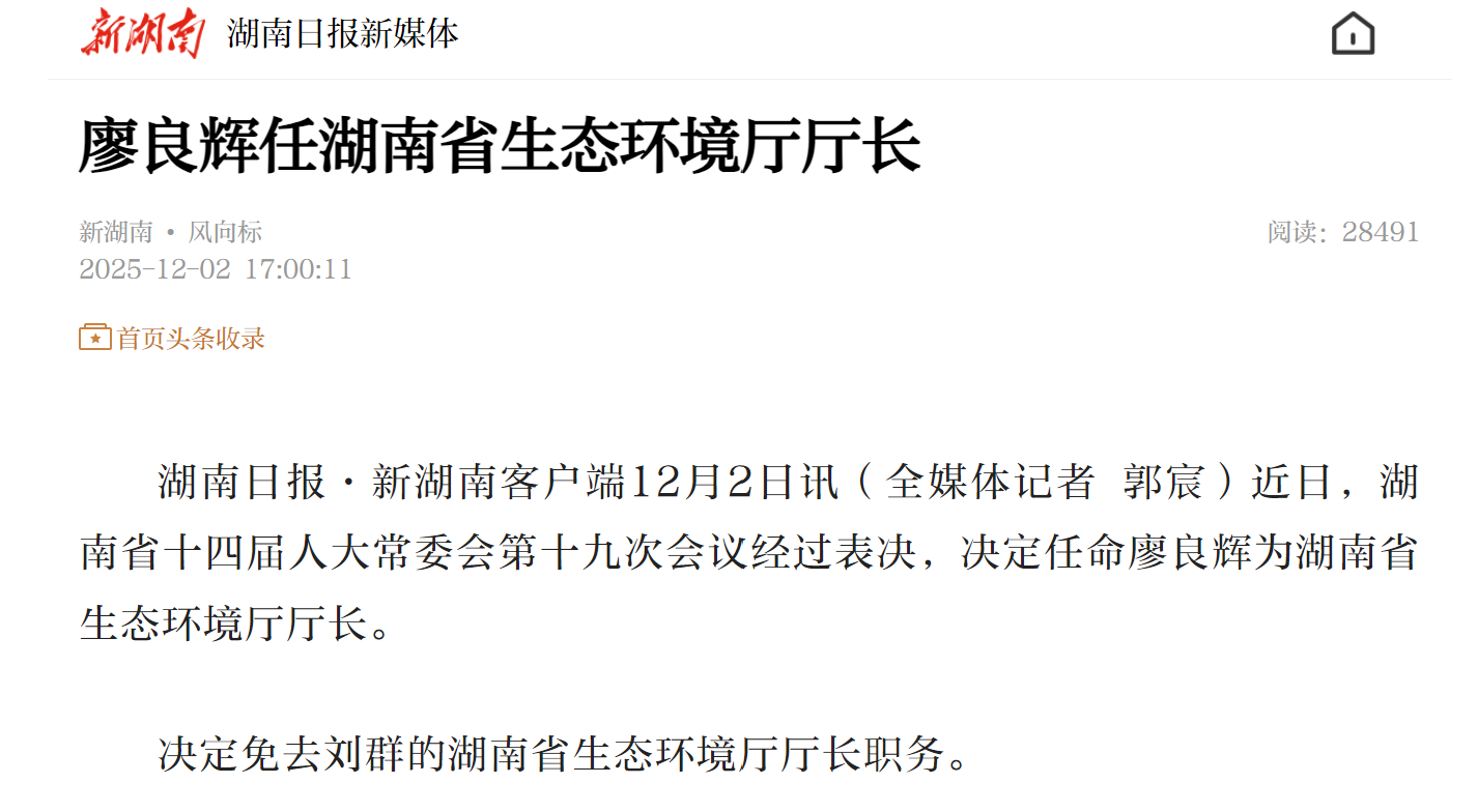 决定免去刘群的湖南省生态环境厅厅长职务。