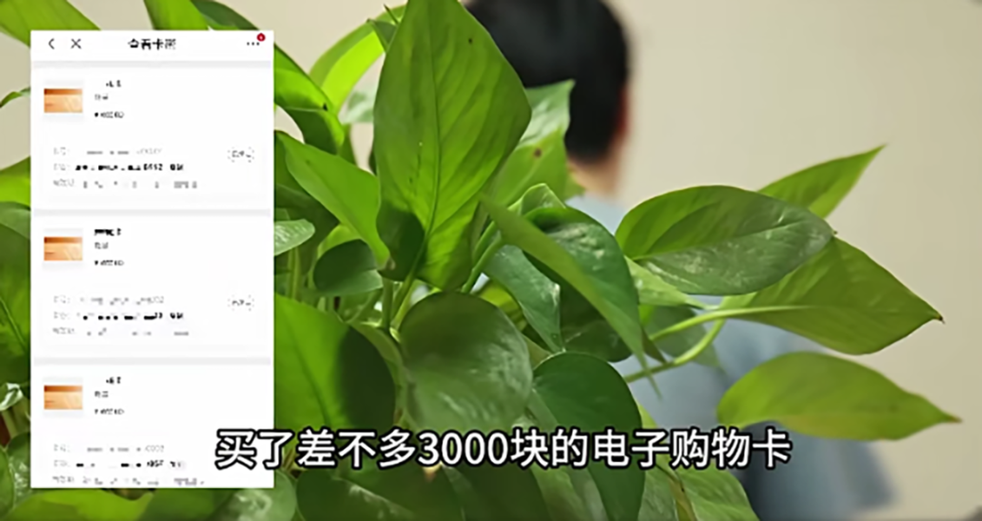 李明在客服的催促下到某APP购买近3000元的电子购物卡,将卡号及密码发送给客服。