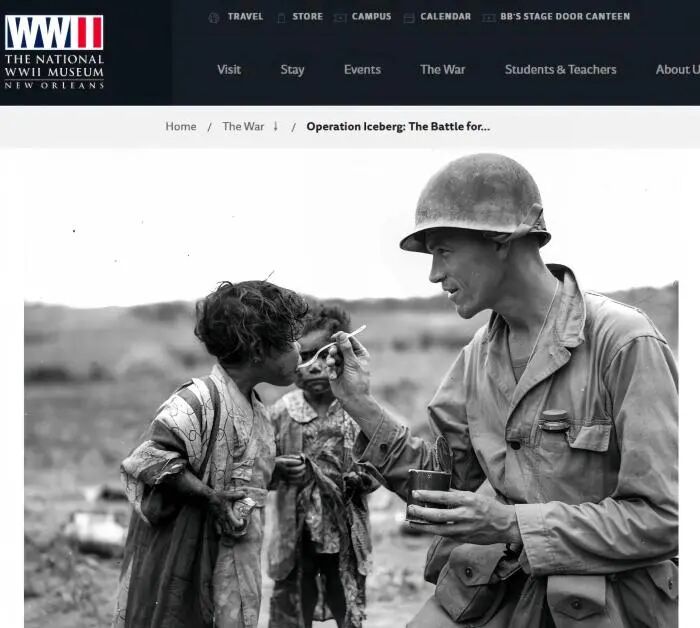 美军给劫后余生的琉球儿童喂饭。图/美国国家二战博物馆