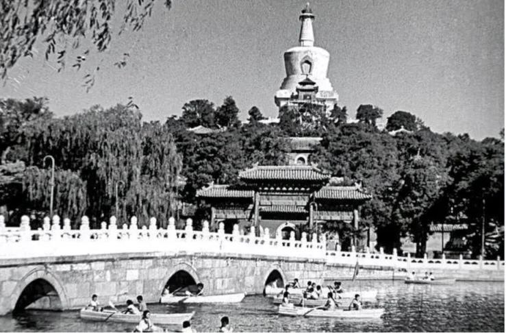 在影片的后半段,最经典的场景出现在“荡起双桨”的北海公园。孩子们划着小船,从琼华岛南侧的永安桥穿过,一路划到五龙亭。当镜头对准五龙亭的时候,如今已经消失的万佛楼,与当时刚建成的东官房大楼,纷纷呈现在画面之内。多年后重温,令人无限感慨。