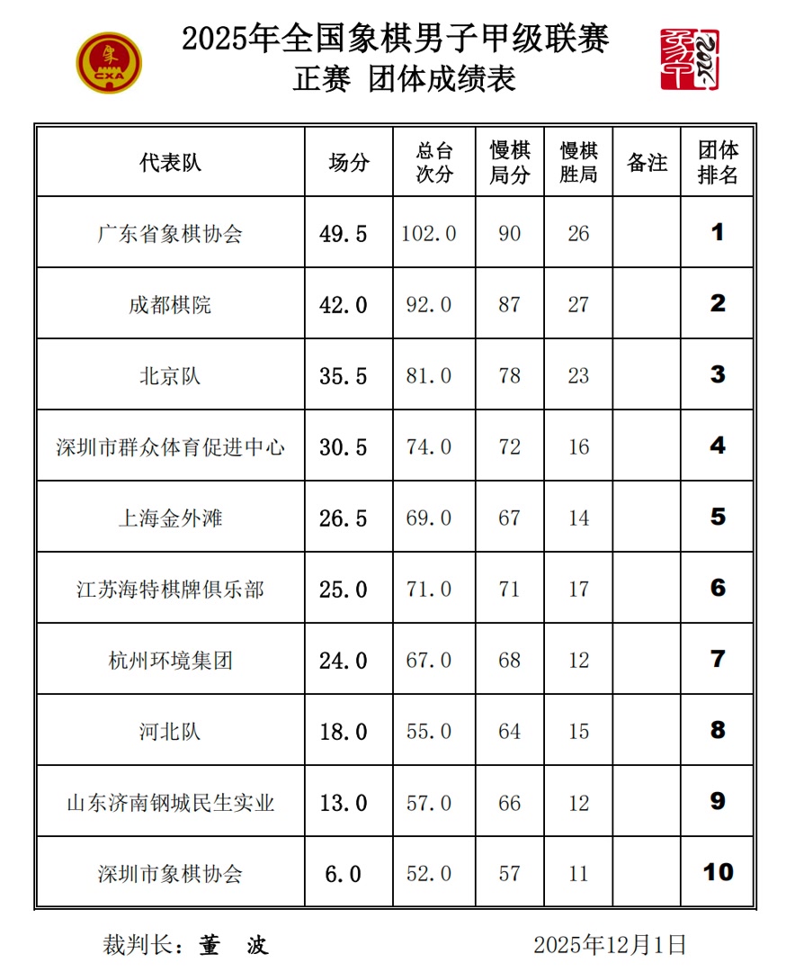 全部18轮比赛结束后,广东队积49.5分获得冠军,成都棋院队积42分获得亚军,北京队积35.5分获得季军。