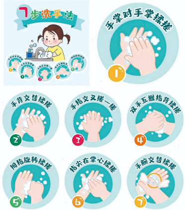 回家后立即用七步洗手法洗手,家长接触孩子前先清洁双手,玩具、餐具每日用开水烫洗。