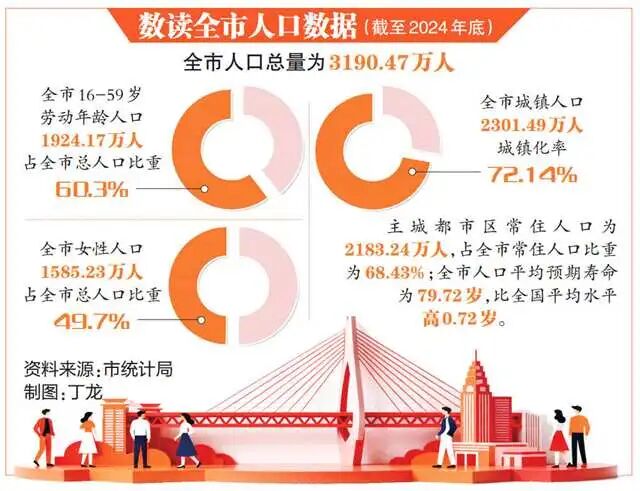 “十四五”以来,我市人口分布继续向城镇和主城都市区集聚。截至2024年底,全市城镇人口为2301.49万人,城镇化率为72.14%;主城都市区常住人口为2183.24万人,占全市常住人口比重为68.43%;全市人口平均预期寿命为79.72岁,比全国平均水平高0.72岁。