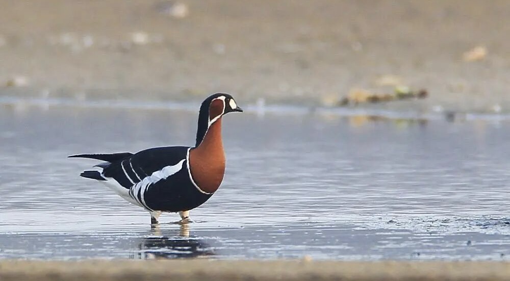 12月2日,北京市延庆区自然保护地管理处科研监测科工作人员在整理日常监测影像时,一组豆雁群照片中,3只体型稍小、羽色特征迥异的鸟引起了工作人员的注意。经详细比对与专家确认,鉴定该鸟为国家二级保护野生动物红胸黑雁。这是红胸黑雁首现野鸭湖湿地,也是北京市首次记录到该鸟类。