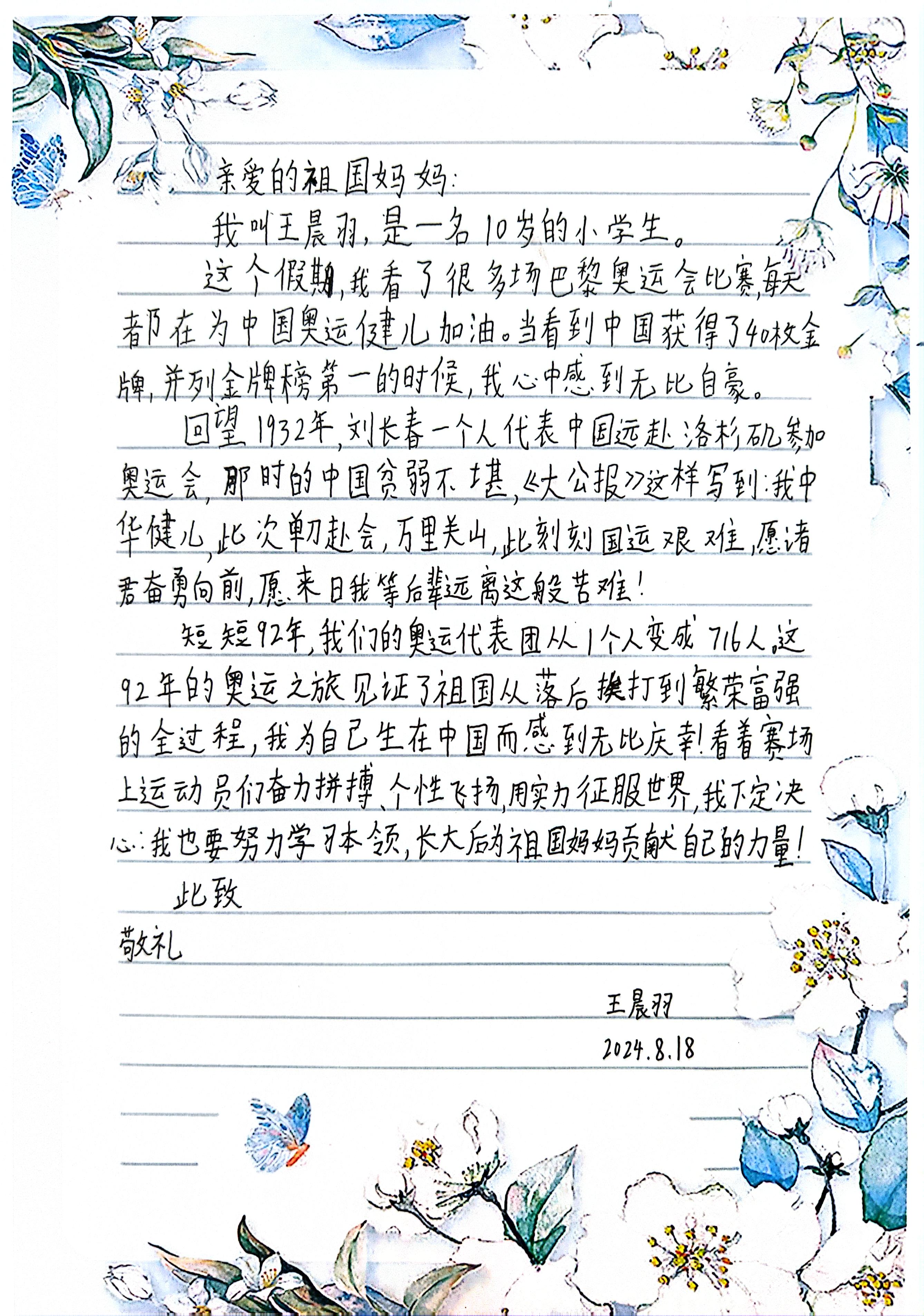 今天这幅AI绘画作品的原型来自北京小学(广外校区)五年级(13)班唐子培的书信作品《我给祖国写封信》。
