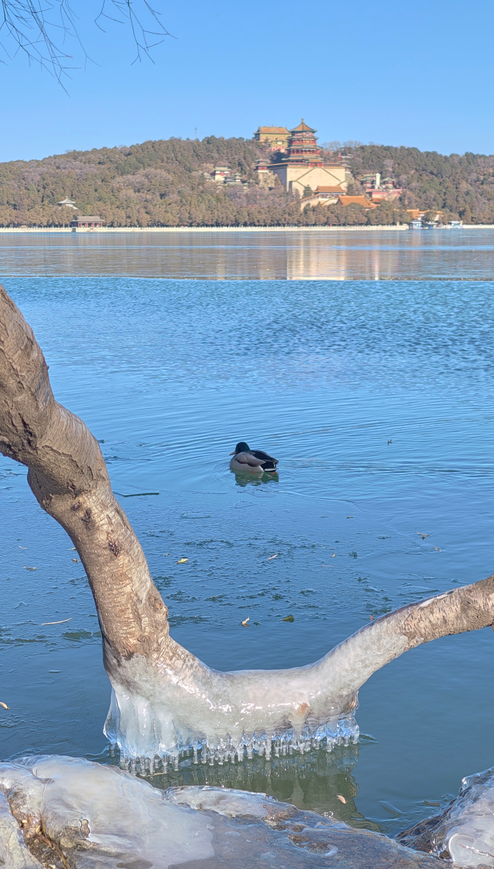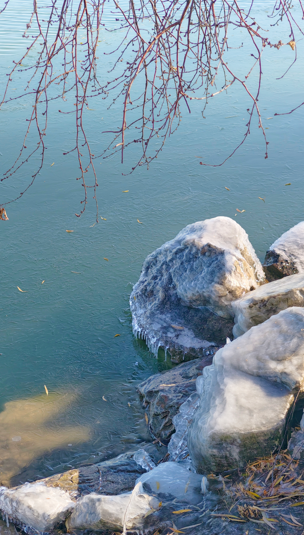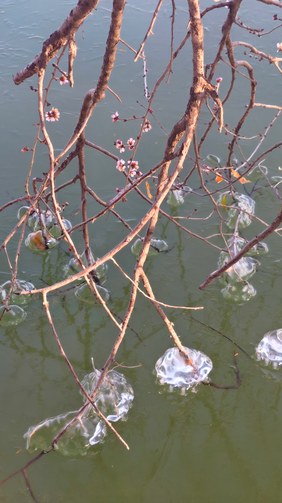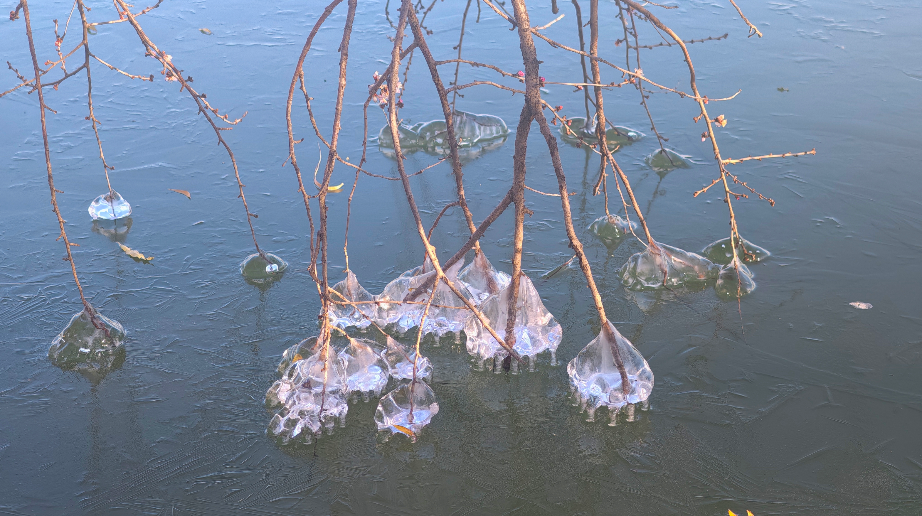 岸边的树枝探向冰面,被透明的冰紧紧裹住,像是大自然亲手打造的水晶雕塑。偶尔路过的鸭子、零星绽放的桃花,则为这独特的景致增添了几分活力。