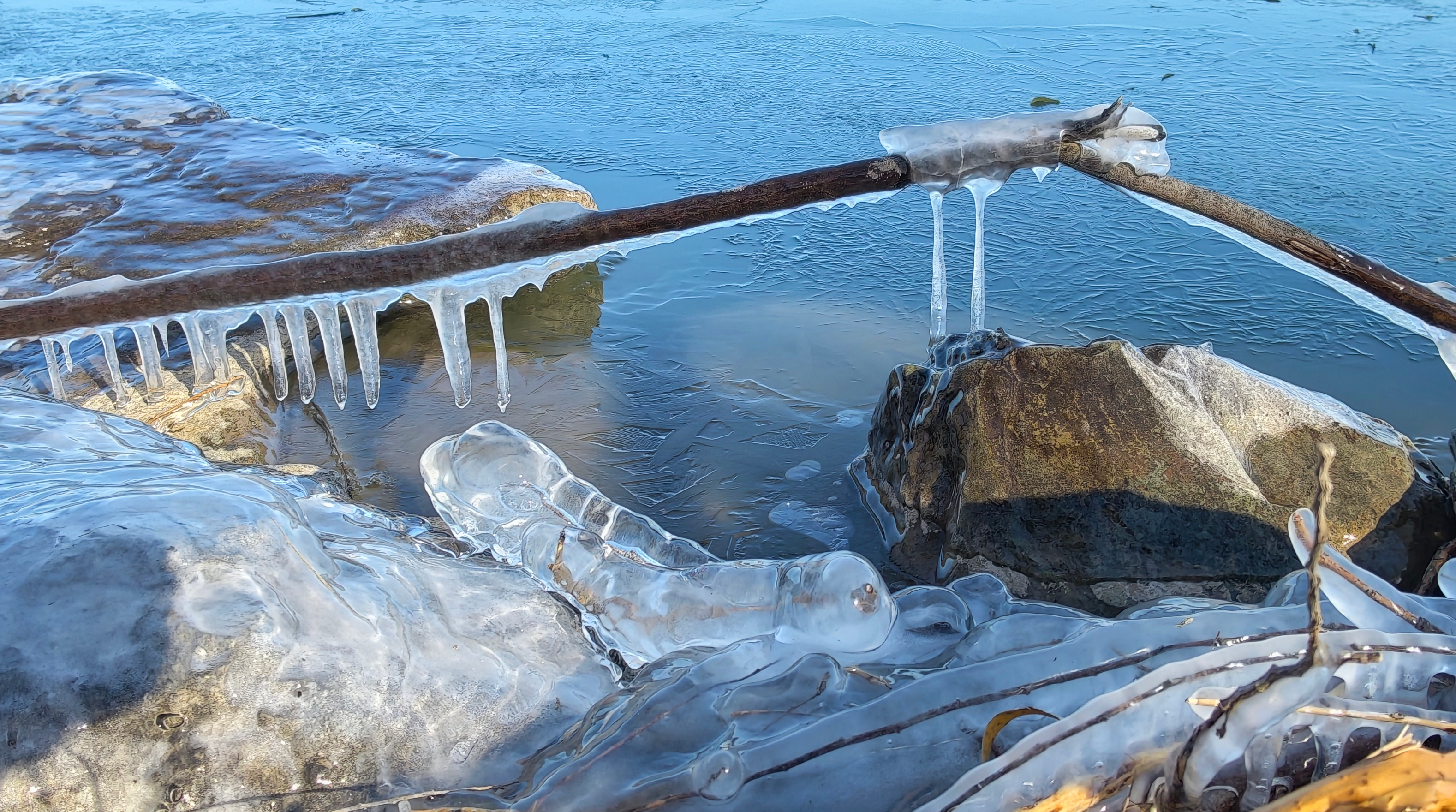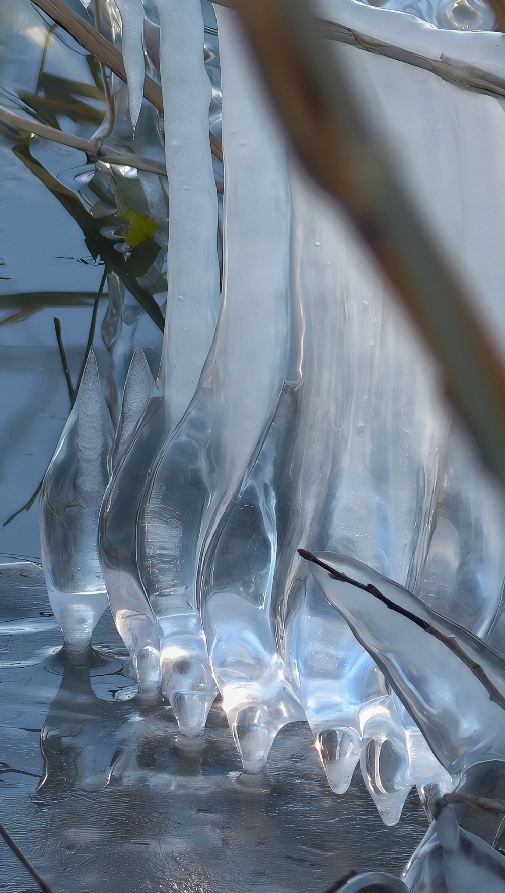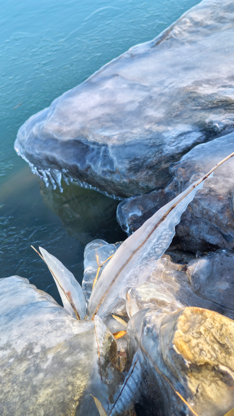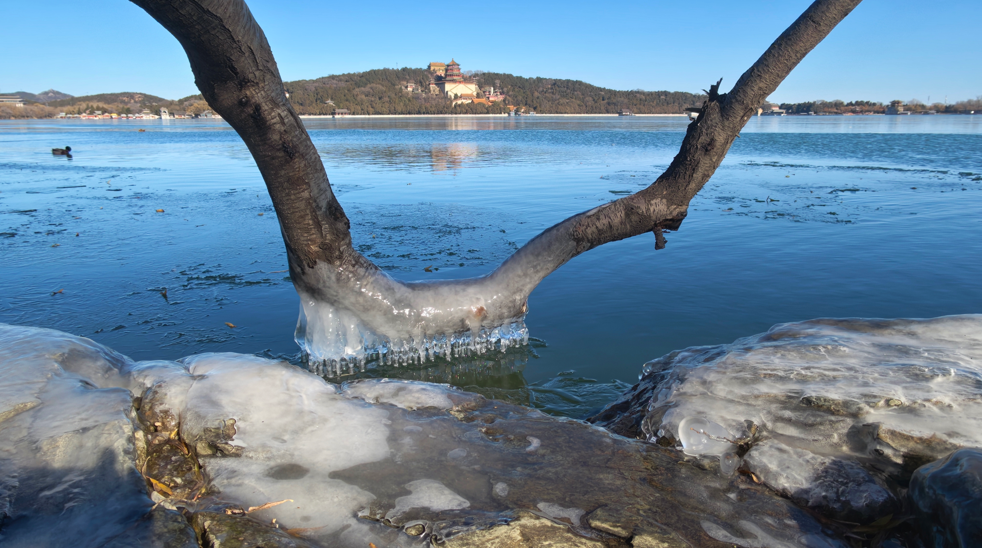 岸边的树枝探向冰面,被透明的冰紧紧裹住,像是大自然亲手打造的水晶雕塑。偶尔路过的鸭子、零星绽放的桃花,则为这独特的景致增添了几分活力。