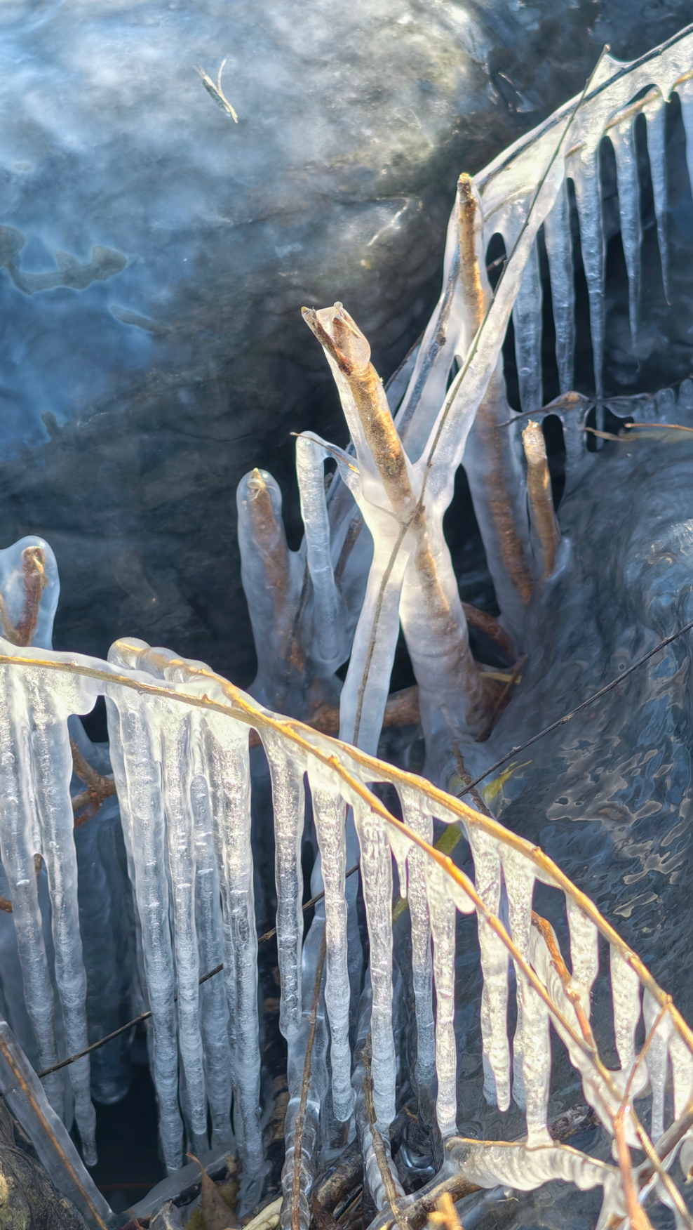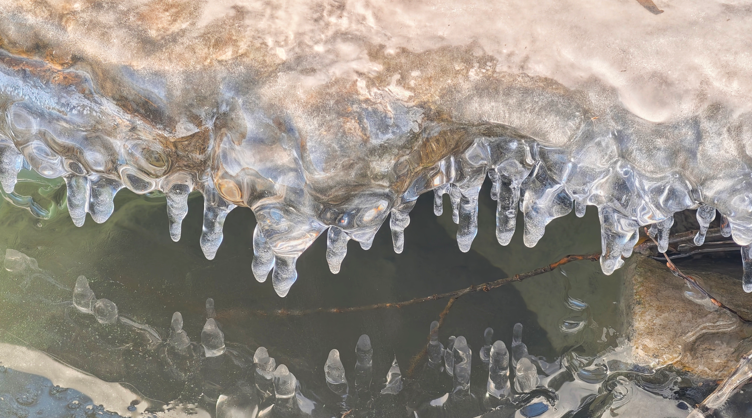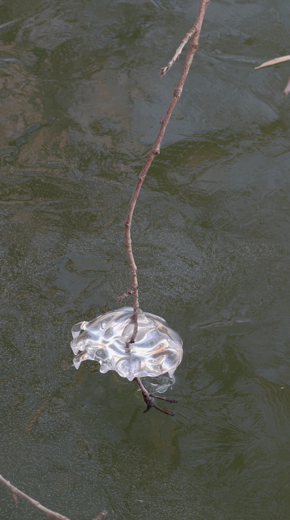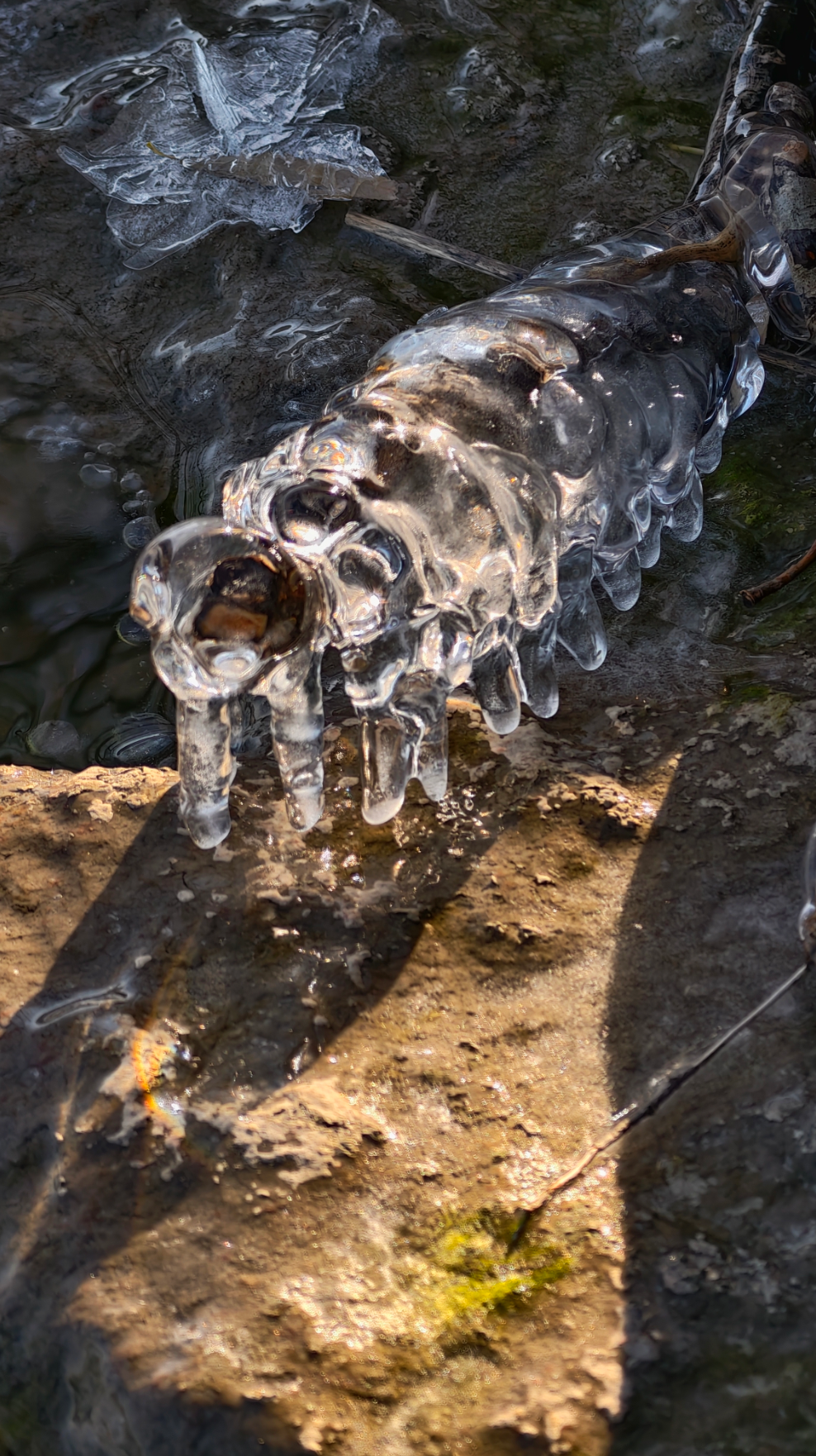 岸边的树枝探向冰面,被透明的冰紧紧裹住,像是大自然亲手打造的水晶雕塑。偶尔路过的鸭子、零星绽放的桃花,则为这独特的景致增添了几分活力。