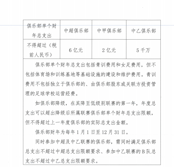 通知同时指出,如俱乐部降级,在其降至低级别联赛的第一年,年度总支出可以超出降级后所属联赛俱乐部单个财年总支出限额,但不得超过上一年度俱乐部的实际总支出金额。同时参加中超及中乙联赛的俱乐部,需同时满足俱乐部 总支出不超过中超总支出限额要求、参加中乙联赛的B队总支出不超过中乙总支出限额要求。