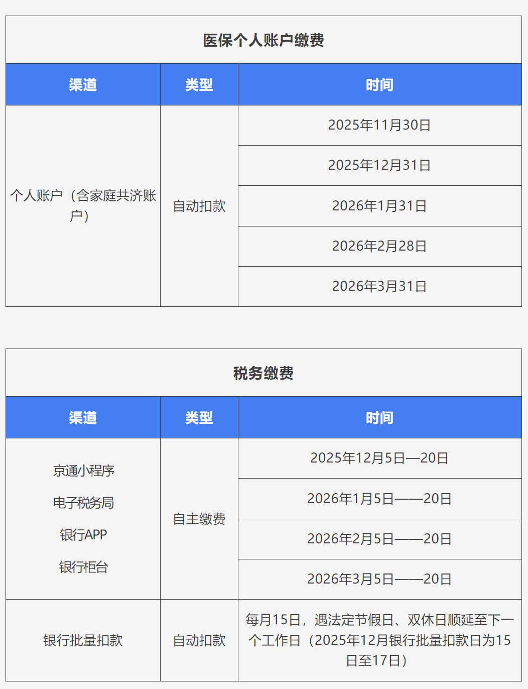 银行批量扣款日为每月15日,遇法定节假日、双休日顺延至下一个工作日(2025年12月银行批量扣款日为15日至17日)。参加批量扣款的缴费人在批量扣款期间不能使用其他渠道缴费。