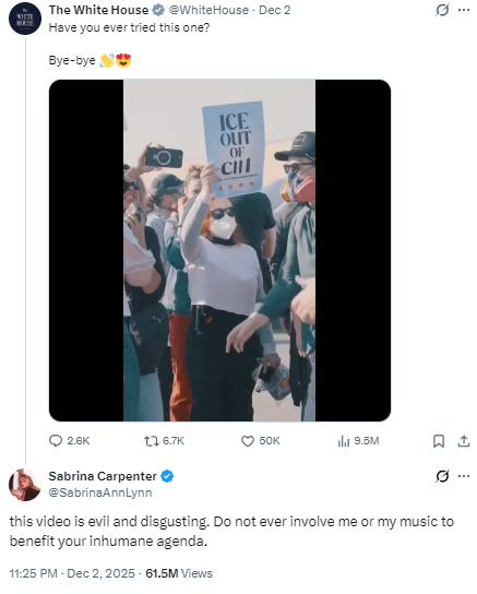 白宫在社交平台X上发布的一段关于美国移民执法行动的视频,其中使用卡彭特2024年热门歌曲《Juno》作为BGM。图为白宫帖文和卡彭特回复截图。