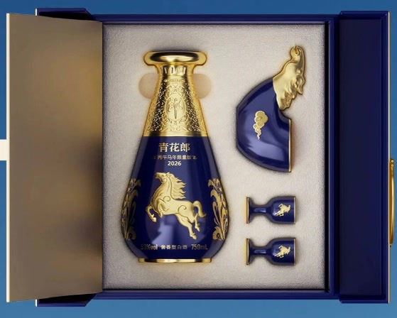 瓶型设计上,流畅圆润的水滴线条张弛有度,尽显经典与时尚;瓶身鎏金骏马图腾栩栩如生,将马的自由、勇敢、进取特质具象化,传递出蓬勃生机。产品配备的专属定制酒杯,杯身镌刻鎏金郎标与骏马标识,细节之处尽显心意。外盒以热烈的中国红为主色,与奔腾骏马相映,既象征马年的热情活力,更承载了新年“红红火火”的喜庆期盼,是日常品饮、节日礼赠、长期收藏的不二之选。