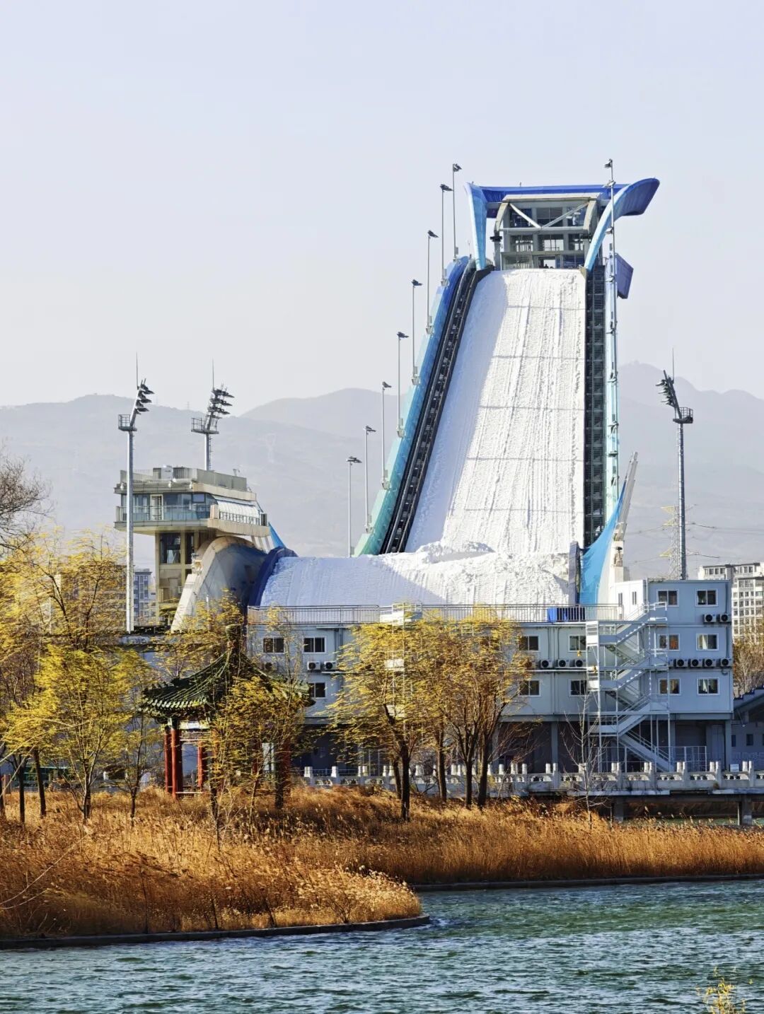 立于群明湖畔,将远处的“雪飞天”与平静的湖面一同纳入取景框。当首钢滑雪大跳台的现代轮廓倒映水中,一张充满诗意的构图便诞生了。