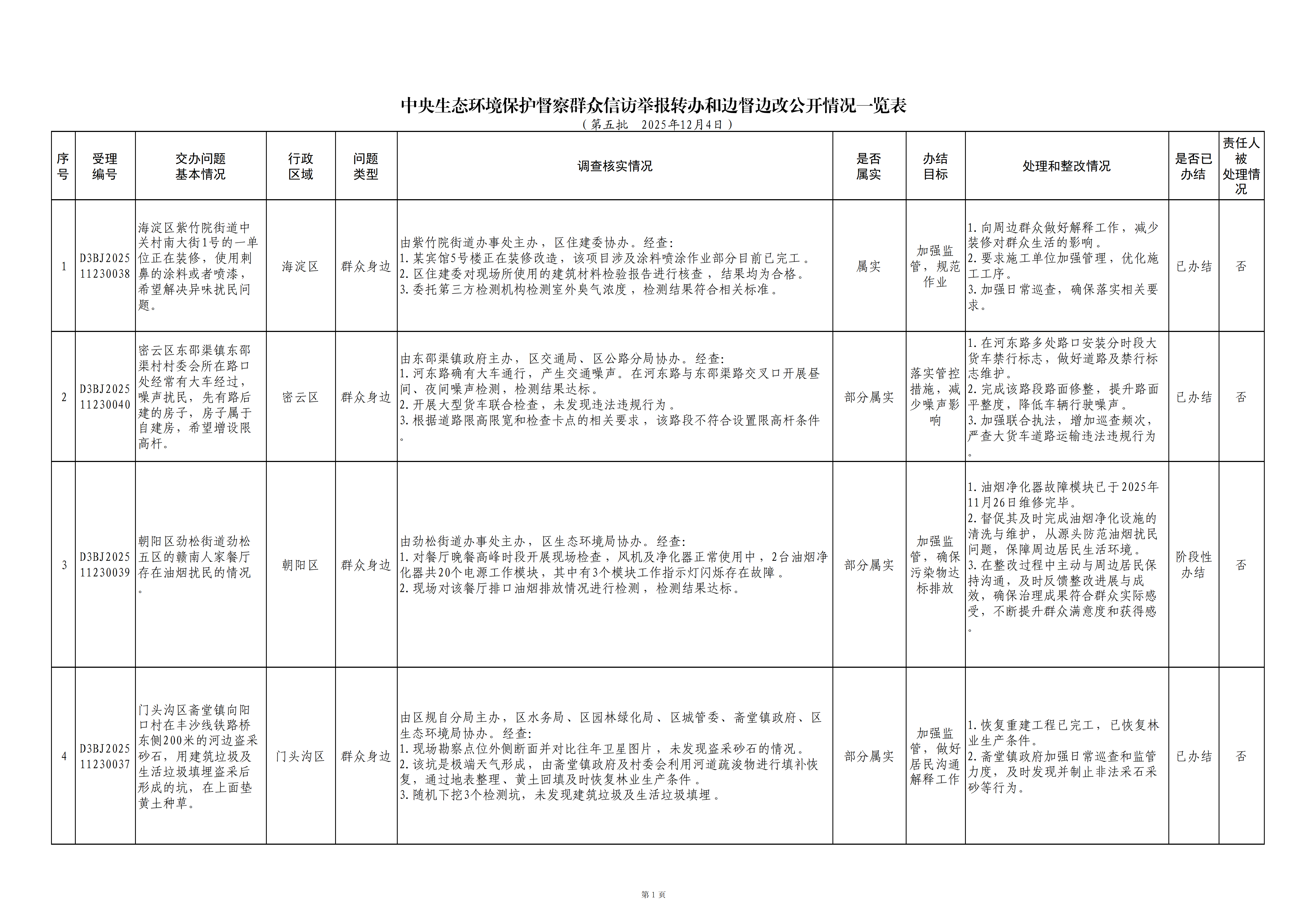 2025年11月24日,中央第一生态环境保护督察组向北京市交办第五批群众信访举报件29件,现按要求向社会公开该批次《中央生态环境保护督察群众信访举报转办和边督边改公开情况一览表》(见下表)