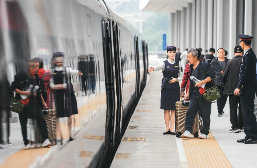 今年9月底,沈(阳)佳(木斯)高铁沈白段开通运营。沈佳高铁沈白段通车后,将进一步优化完善东北地区高铁网布局,促进长春都市圈高质量发展。图为旅客在抚顺站准备乘车。新华社记者 潘昱龙摄