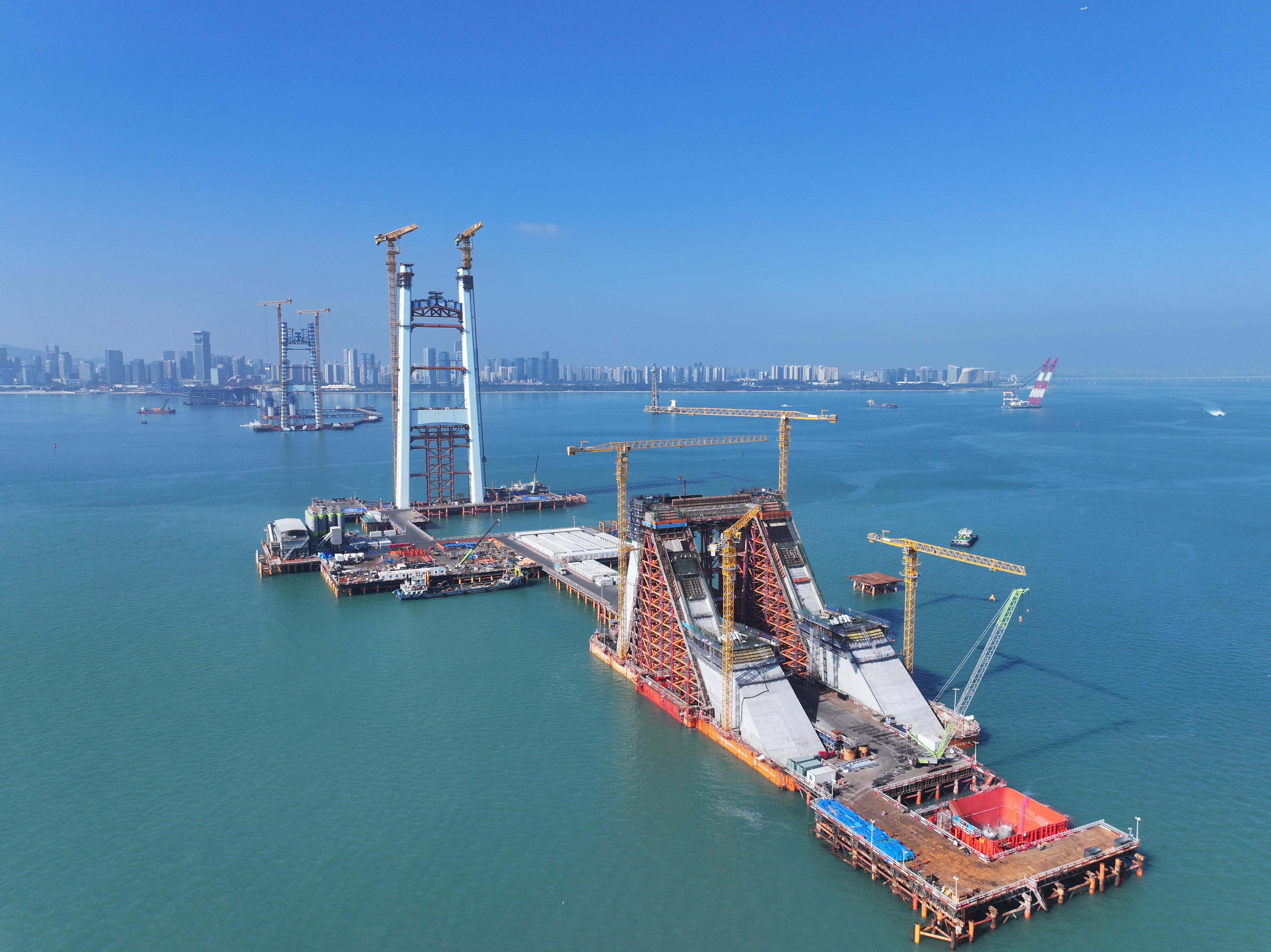 此次封顶主塔为预制装配化大型海中桥塔,在海洋环境中创新采用无筋钢壳混凝土组合结构。塔柱钢构件均在工厂内预制完成,再通过海运至施工水域,由大型起重机完成高精度安装,施工过程如同“搭积木”。