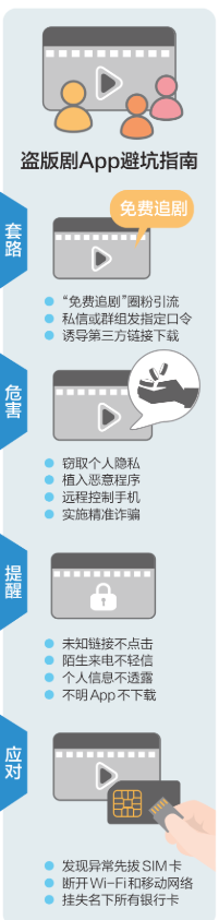 “恪守‘四不原则’是防范电信网络诈骗的核心,要做到未知链接不点击、陌生来电不轻信、个人信息不透露、不明App不下载。”王佳强调,正规的影视资源需要通过官方平台观看,不要为了节省会员费而下载非应用商店的App,“这些App没有经过正规审核,风险极高,可能包含恶意程序和病毒。”