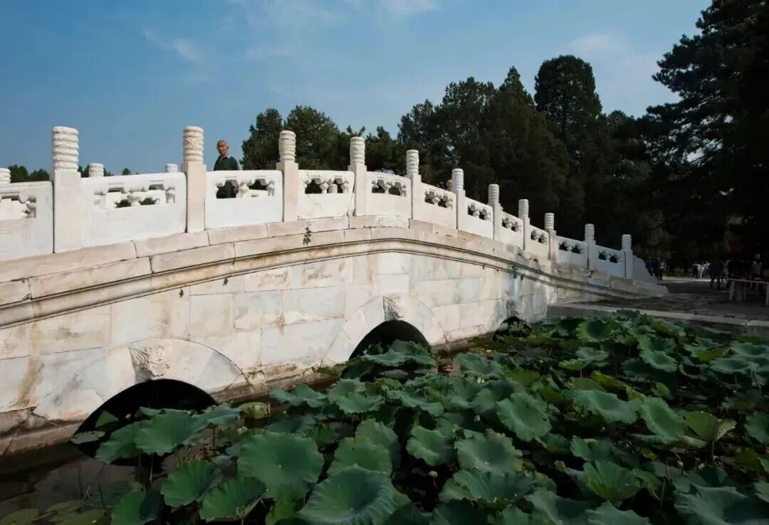 (2)妃园寝宫门前有一座一孔拱桥,火焰柱头,皇后陵为一座三孔拱桥,龙凤望柱头。