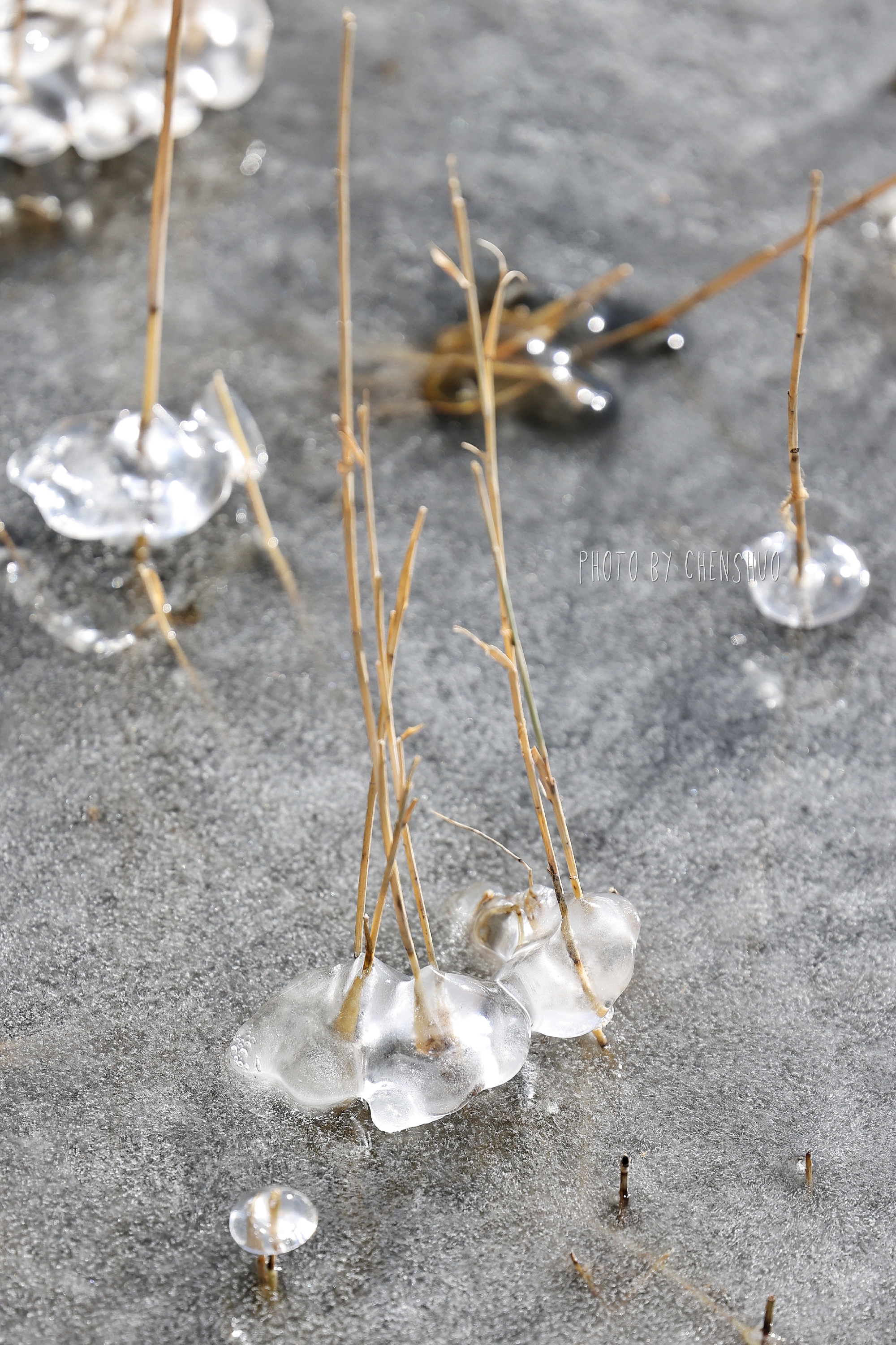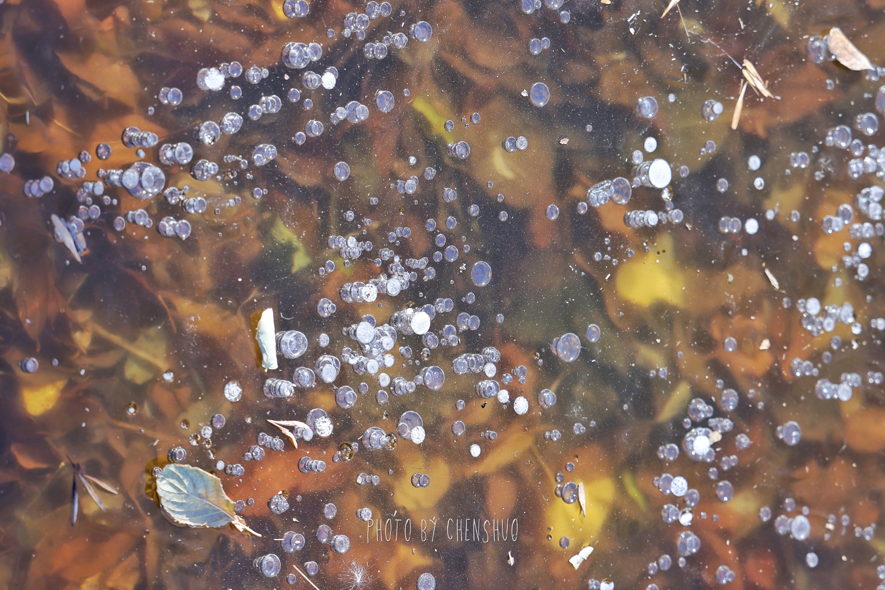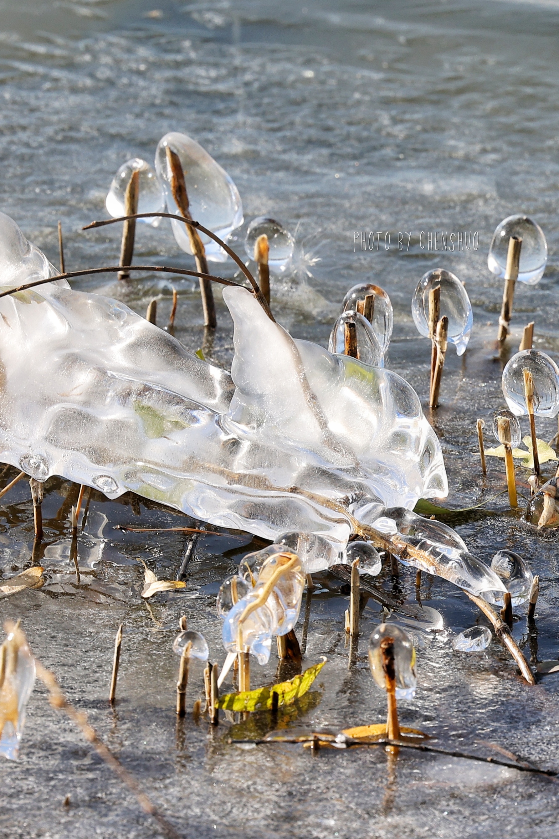 冰里裹着枯草好像“水晶琥珀”。石头边挂着的冰锥像不像谁偷偷藏的水晶帘?连水里的气泡都被冻成了一整池“碎钻”,每一张都像开了自然滤镜!