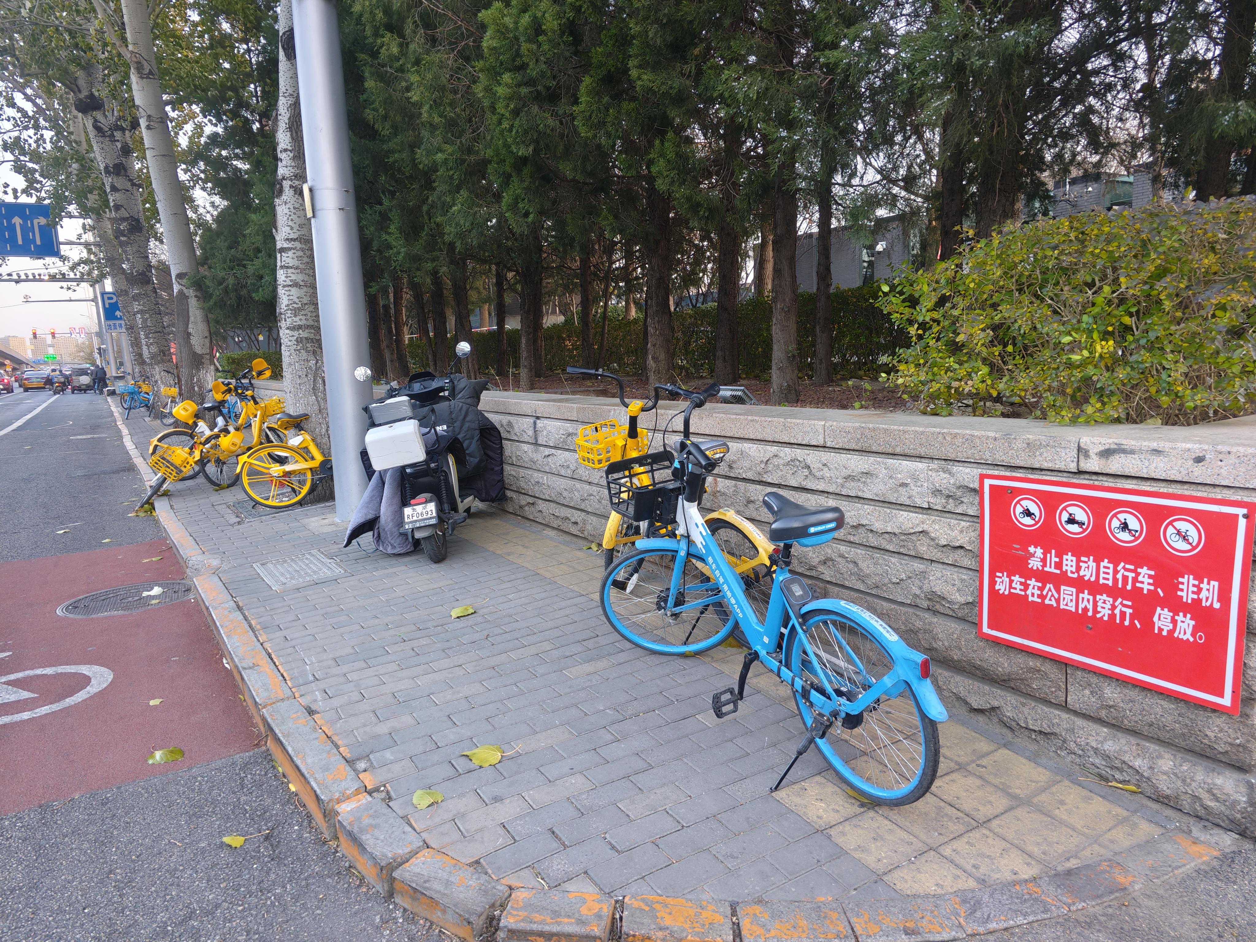 随后,记者来到雍和宫站E口,此处出入口也配有扶梯和无障碍坡道,从出站到通往路边的人行步道,一路都有坡化处理。但遗憾的是,顺着坡道来到路边后,无论是向左走还是向右走,人行步道全都被共享单车、电动自行车拦住去路。记者注意到,此处步道较窄,被自行车霸占后,别说是轮椅,就连普通人正常行走也没有空间,只能借非机动车道通行。