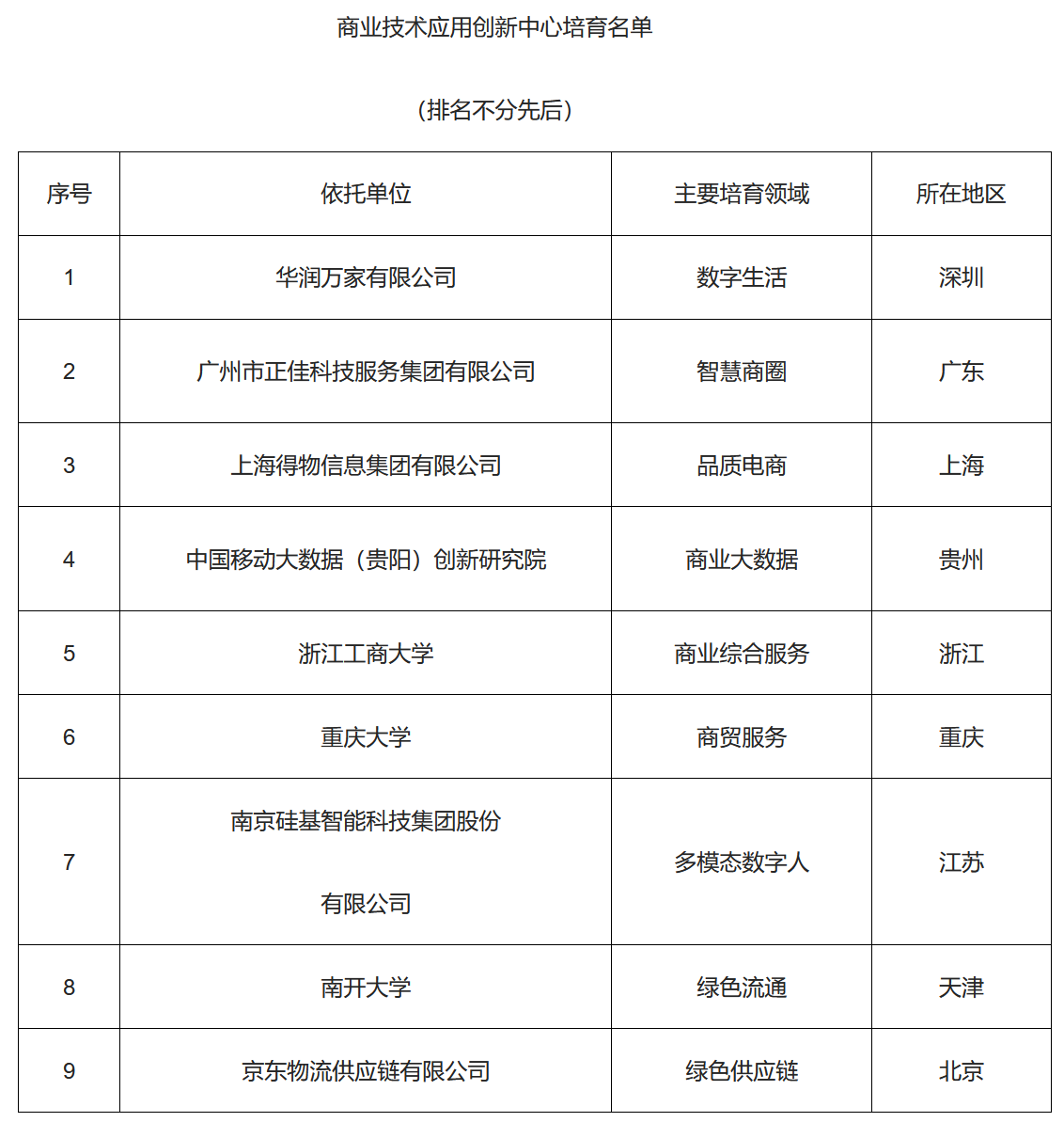 根据《商务部办公厅关于开展商业技术应用创新中心建设的通知》(商办建函〔2024〕391号)要求,在各地申报的基础上,经专家评审并向社会公示,9家单位列入商业技术应用创新中心培育名单,现予公布。请各地商务主管部门积极支持商业技术应用创新中心建设,做好督促管理,指导有关依托单位进一步完善建设计划任务书,并按计划开展建设工作,建设期不超过2年。