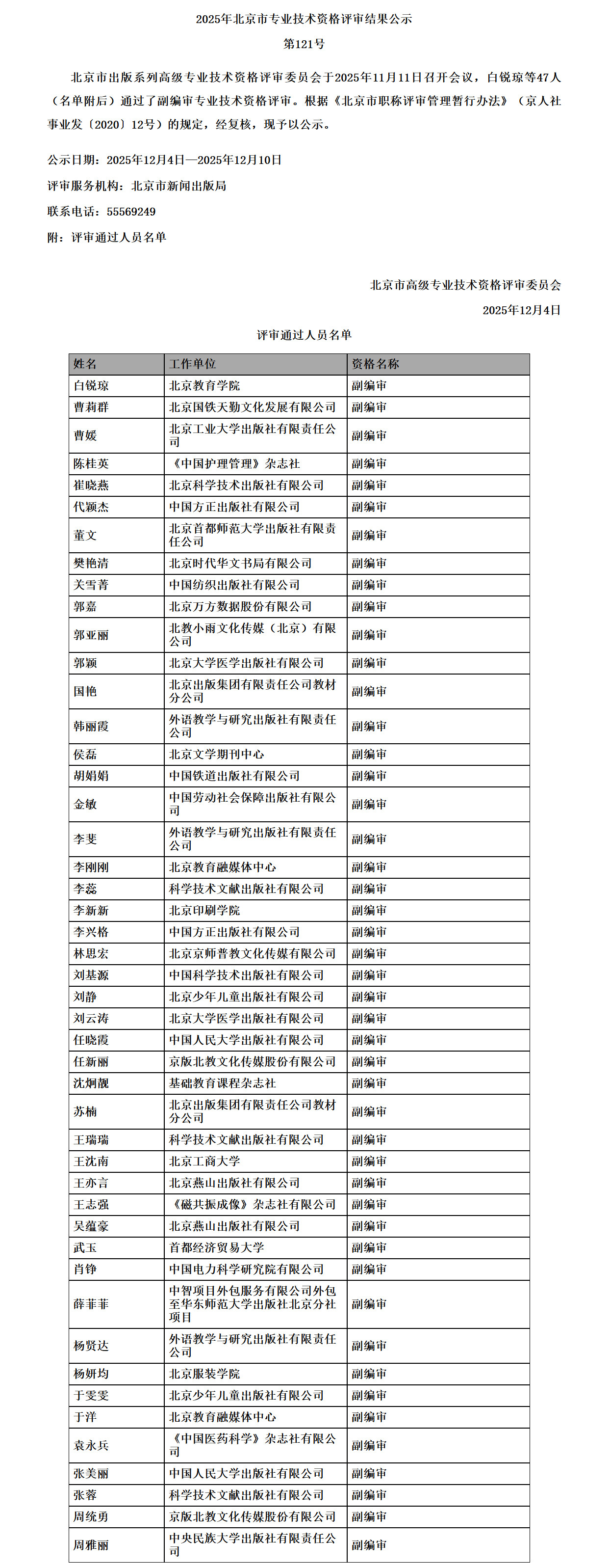 2025年北京市高级专业技术资格评审结果公示(出版系列)