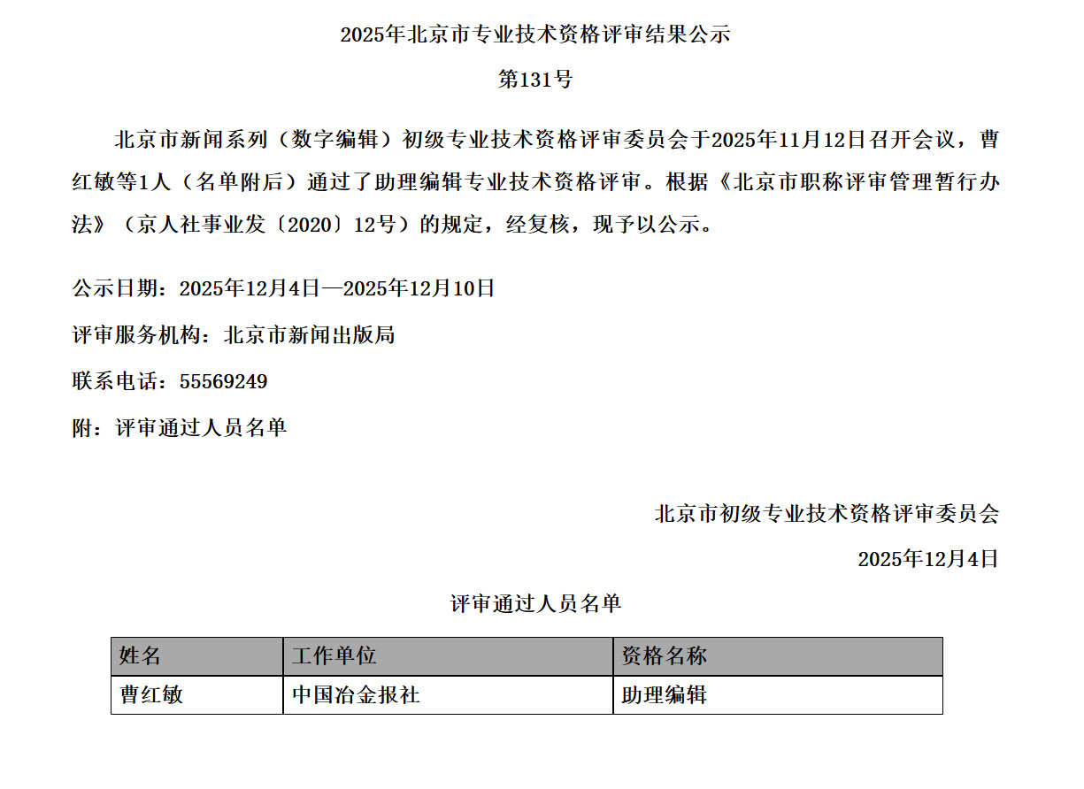 北京市初级专业技术资格评审结果公示(新闻系列数字编辑)