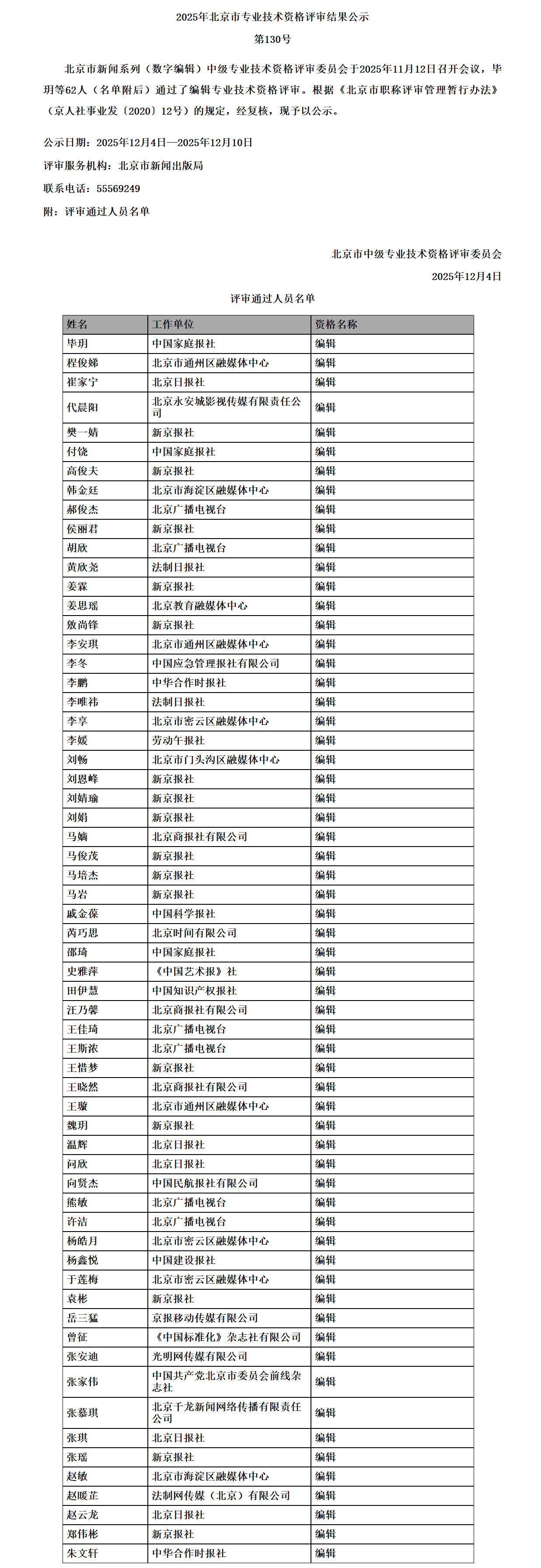 北京市中级专业技术资格评审结果公示(新闻系列数字编辑)