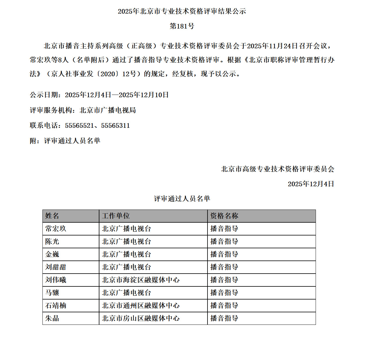 北京市高级(正高级)专业技术资格评审结果公示(播音主持系列)