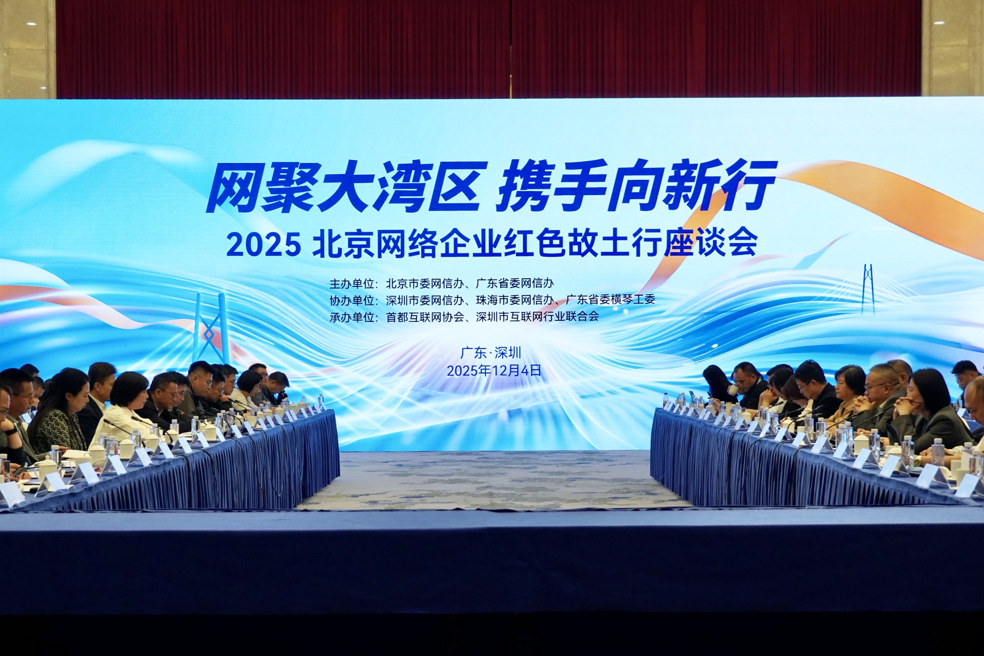 12月4日下午,由北京市委网信办、广东省委网信办主办,深圳市委网信办、珠海市委网信办、广东省委横琴工委协办,首都互联网协会、深圳市互联网行业联合会承办的“网聚大湾区 携手向新行——2025北京网络企业红色故土行”座谈会在深圳五洲宾馆召开。北京市委网信办、广东省委网信办、深圳市委网信办、珠海市委网信办有关负责同志,深圳市发改委、市工信局、市商务局、市投资促进局、市文广旅体局分管负责同志,深圳市区各区委网信办、大鹏新区综合办、深汕特别合作区党政办主要负责同志以及京东、百度、微博、面壁智能、腾讯、大疆、影石、荣耀等北京、深圳重点互联网企业代表负责人等80余人参加。