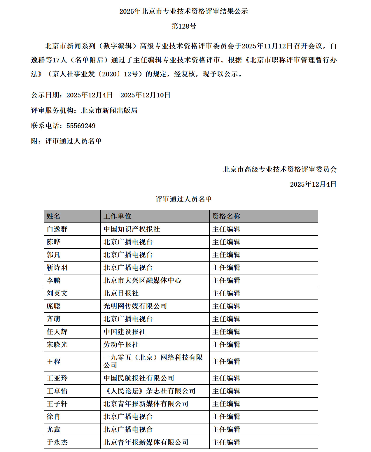 北京市高级专业技术资格评审结果公示(新闻系列数字编辑)