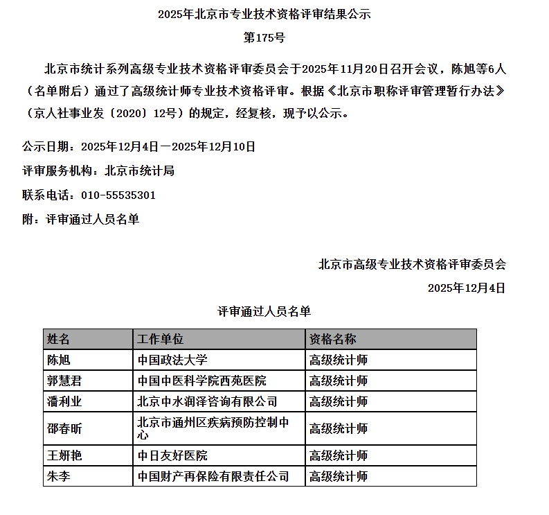 北京2025年度职称评审结果公示