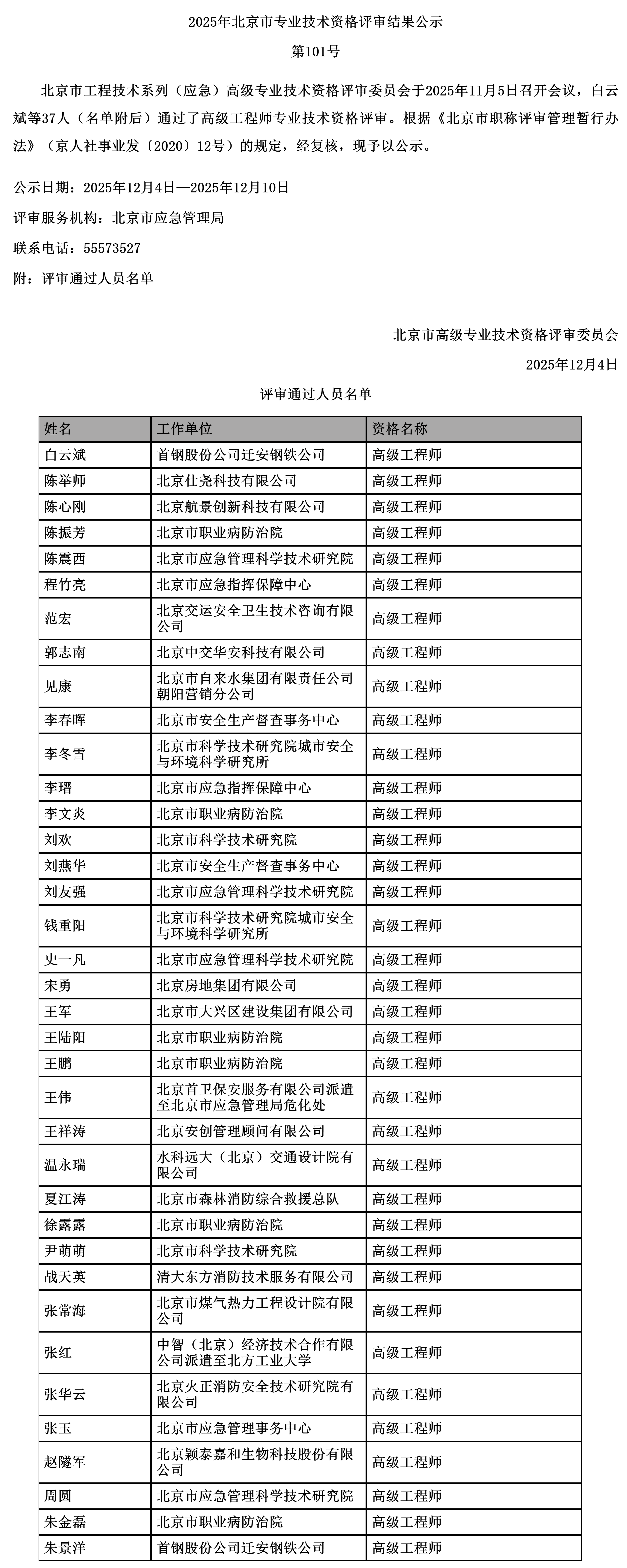 北京市高级职称评审结果公示:工程技术系列应急