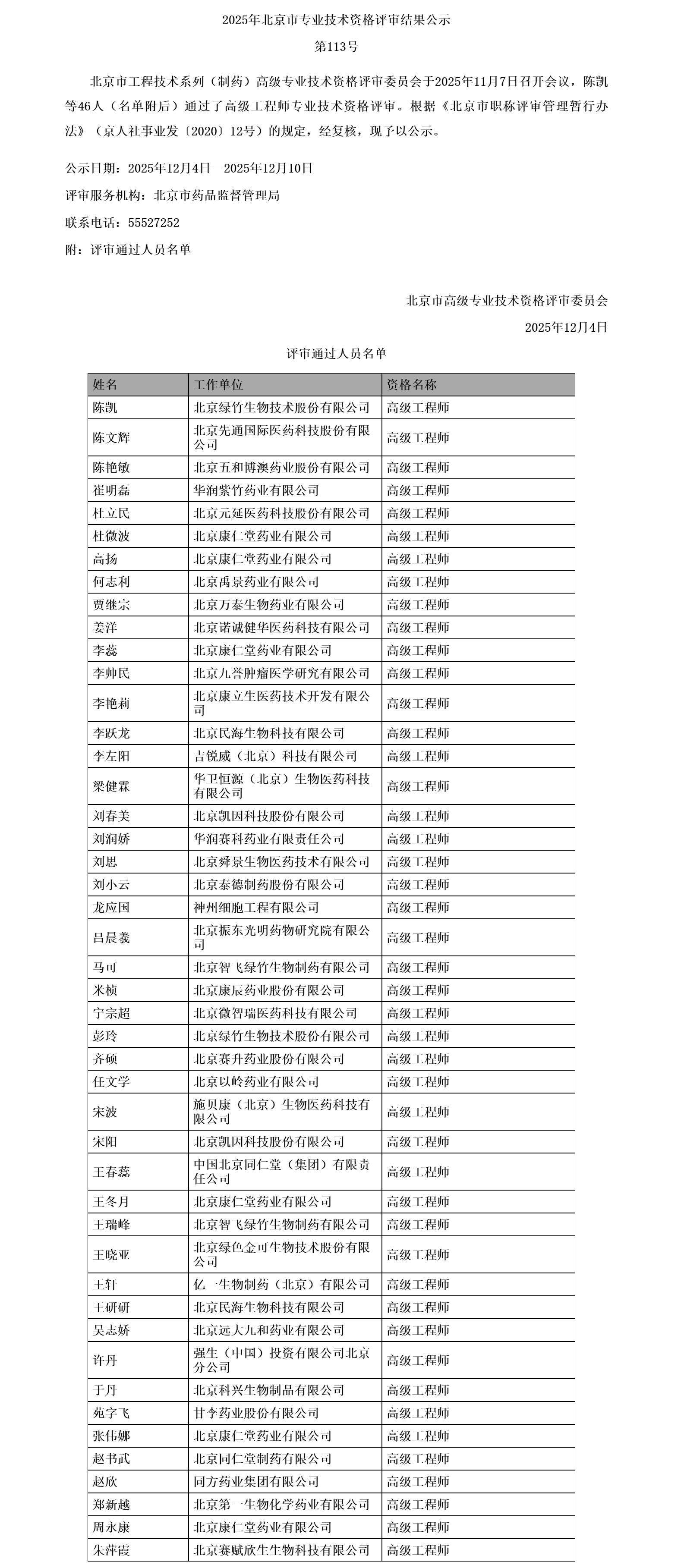 北京市高级职称评审结果公示:工程技术系列制药